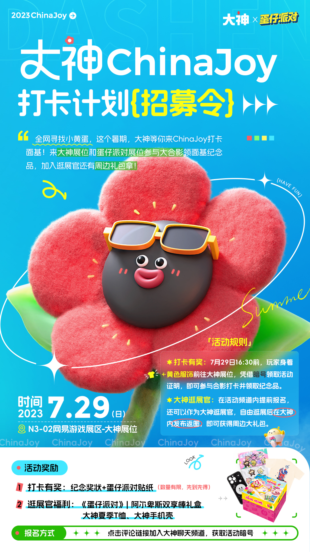还没做好出行计划吗?前方假期游玩攻略高能来袭!2023年上海ChinaJoy展即将在7月28日启幕,网易大神要在ChinaJoy展览上放大招啦! 作为当今全球数字娱乐领域最具知名度与影响力的年度盛会之一,ChinaJoy展会业已成为中国亿万玩家喜闻乐道的行业盛会,展会以游戏为核心,全面覆盖游戏、动漫、电子竞技、潮玩潮品、互联网影视与音乐、网络文学、智能娱乐软件及硬件等数字娱乐多领域,全景呈现以新科技为驱动的数字娱乐产业发展盛况。 7月28日至7月31日(周五到周一),前往上海新国际博览中心N3-02网易游戏展区大神展位体验真人版大富翁游戏,惊喜不断好礼抽不停,超多游戏奖品等你来赢!参与大神×《蛋仔派对》快闪活动更有机会赢取纪念品以及周边大礼包!这个夏天,大神约定你~ 网易大神摊位惊艳亮相,助力玩家玩转缤纷夏日! 游戏热爱者集结,玩转大神CJ展!大神夏日好玩大会即将在ChinaJoy惊喜上线,浓浓夏日海浪风,让你抛开烦恼,参与好玩的互动游戏,唤醒你的夏日活力!大神提前爆料,届时还将会有热门游戏Coser助阵,化身“大神快闪店长”与玩家们互动哦,展览期间更有持续的福利放送,点燃玩家们的热情! 除此以外,大神将推出大富翁抽奖活动。7月28日至7月30日展会期间期间,大富翁抽奖活动每日限时开放,只要参与活动任务,就有好礼相送!至于具体都有哪些活动任务,大神在这里先买个关子,大家可以前往大神APP的聊天频道一探究竟! 大神×《蛋仔派对》快闪活动上线,多重好礼等你领! 大神APP联动《蛋仔派对》齐齐参展亮相,全网寻找小黄蛋!7月29日16:30前,穿上黄色颜色的衣服前往大神展台和蛋仔派对展台,凭借活动暗号领取活动证明参与合影打卡,打卡成功后即可领取纪念品!想要知道“碰头暗号”是什么吗?那就加入大神聊天频道逛逛吧! 大神在线招募逛展官,额外领取周边大礼包!在大神APP活动频道提前报名,成为大神逛展官观展并且拍照打卡,将图片分享到大神APP后即可领取大神联合蛋仔送出的周边大礼包!既能看展又能领取丰厚的周边大礼包,这波福利必须冲鸭! 活动频道入口:http://u9v.cn/5Mivgp 火力全开,实力宠粉!大神ChinaJoy展览即将在这个夏日重磅登场,高能福利大放送!来大神摊位每日游戏周边及设备抽不停,限时大富翁活动豪送精致奖品,更有大神×《蛋仔派对》特别活动送出的福利!大神夏日好玩大会开幕在即,期待与你们一同感受大神CJ展上的火热气氛! 关于【大神】 大神是网易游戏旗下的游戏玩家交友社区。 这里汇聚了广大精英玩家、游戏圈红人、行业大咖,集合了网易独家的官方资讯和福利趣闻,旨在为玩家打造一个丰富的游戏兴趣社交圈。 玩家可以在大神与游戏中的好友实时聊天、多元互动;以游戏会友,结交更多游戏同好,和大神一起发现更多游戏乐趣。 |