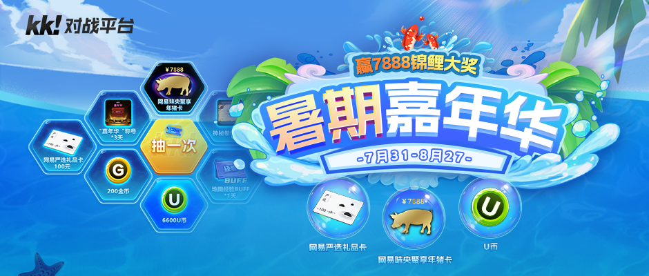 玩游戏得奖金,双倍快乐等你领!KK对战平台暑期嘉年华活动火热开启~ 嘉年华期间(7月31日-8月27日),不仅有多款热门地图等你来挑战,还能参与抽奖赢取价值7888元的网易味央聚享年猪卡,同时还有网易严选礼品卡和百万U币大放送! 重磅大礼包!瓜分万元豪礼! 活动期间,游玩平台地图就有机会获得嘉年华礼券,在活动页参与抽奖,有机会赢价值7888元的网易味央聚享年猪卡、价值100元的网易严选礼品卡和平台U币,还有经验书和平台装饰道具等更多好礼。 网易味央聚享年猪卡 网易严选礼品卡 平台U币 奖励再升级!夏日积分兑换超值奖品 活动期间,通过抽奖还能获得夏日积分,可在活动页兑换专属头像——洛神、平台热图的专属SSR级道具、自选地图抽奖券和更多好礼,千万不要错过哦! 洛神头像*永久 地图抽奖券 夏日特优惠!超炫入房特效等你来拿 活动期间,购买平台尊享会员*30天和嘉年华夏日8折礼包,额外赠送嘉年华礼券,助力一夏! 其中嘉年华夏日礼包更是包含经验书(通用)*5本和进场特效*永久,让你每次加入地图房间都与众不同。 拯救游戏荒!KK好图陪你畅玩一夏 活动期间,平台众多地图联手打造独特的活动玩法,关注KK对战平台,福利好图尽享无遗。 |