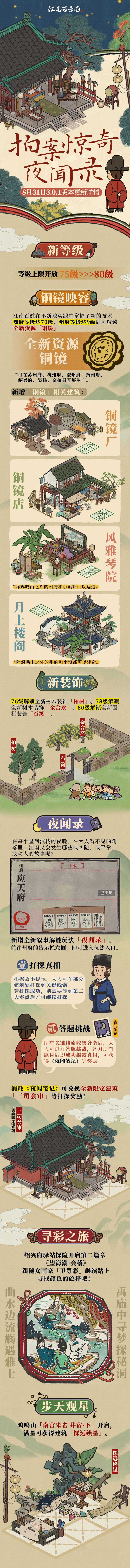 拍案惊奇夜闻录,《江南百景图》3.0.1新版本上线啦! 本次新版本中知府大人可以升级至80级,并进行「铜镜」资源线的生产及建造;在新玩法「夜闻录」中体味江南平凡百姓的悲欢喜乐;跟随「徐霞客游记」游历大好山河,领略各地风土人情。另有全新音游活动即将上线,将于9月14日开启,敬请期待! 探寻夜闻录,破谜真相现 每个星河流转的夜晚,在知府大人看不见的角落里,江南又会发生哪些或凶险、或平常、或动人的故事呢? 3.0.1版本新增全新叙事解谜玩法【夜闻录】,根据提示打探线索,揭开事件真相!成功完成答题挑战,可获得全新建筑「三司会审」等打探奖励! 遍访山河色,行中多奇遇 大丈夫当朝碧海而暮苍梧!全新【徐霞客游记】即将开启,跟随徐霞客走遍祖国大好河山,记录沿途风土人情,与江南居民们分享一路见闻吧! 消耗资源筹集盘缠,前往各城市游历,触发奇遇,积攒游历点数,可兑换全新建筑「热海蒸云」等丰富奖励! 心如明镜台,时时勤拂拭 江南百姓在不断的实践中掌握了新的技术,全新资源「铜镜」等大人解锁!知府可营造「铜镜店」、「风雅琴院」、「月上楼阁」等相关建筑来装点你的江南小镇。 青壁竹篱门,柏下金合欢。本次的新版本中,新增全新围栏装饰「石篱」,全新树木装饰「柏树」、「金合欢」,知府可随心搭配,丰富小镇布局。 影倒桥下月,江南百景饶 对影成双笑,相伴过水桥。全新特殊建筑「双影桥」现身江南,当关系好的居民结伴路过此桥时,会在桥上停留,桥下水面会呈现出他们的倒影。 唢呐音嘹亮,歌声自悠扬 全新音游活动即将上线!9月14日起,包不凡将在城中游逛,找到身边有百灵鸟围绕的他,演奏松江府主题曲《入画江南》、《茉莉花》等动人的曲目吧! 更多游戏更新详情,知府可查看下方长图。 |