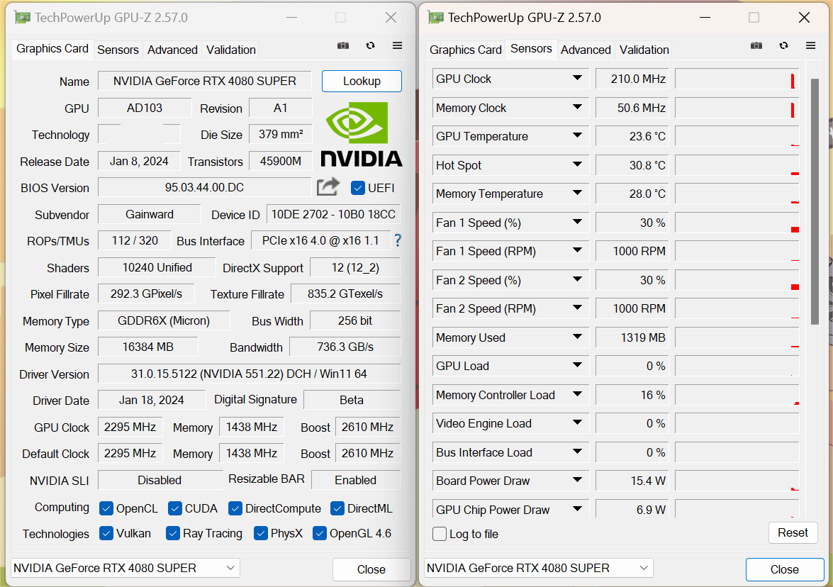 随着耕升 GeForce RTX 4070 SUPER 和耕升 GeForce RTX 4070 Ti SUPER系列显卡的性能曝光和正式开售。本次耕升 GeForce RTX 40 SUPER显卡在1月31号迎来最后一个系列耕升 GeForce RTX 4080 SUPER 炫光 OC和追风显卡的登场!两款显卡也会在今晚22:00正式发售,建议零售价分别为8099元和8599元! 下面就一起来看看本次的评测对象耕升 GeForce RTX 4080 SUPER 炫光 OC的具体情况吧!其极致的性价比和颜值外观相信会让各位用户眼前一亮! 耕升 GeForce RTX 4080 SUPER 炫光 OC外壳采用看似全黑,实则带有灯光特效的酷炫外壳。同时显卡还支持ARGB可调灯效,与主流主板同步灯效,这使其能够与整个系统的灯光效果同步,提供更加个性化和华丽的视觉效果。 再加上出色的显卡规格和大气的设计让显卡散发出一种流线型美感。对于颜值玩家来说,绝对是装机时的首选。 拆解图例 再来一起看看耕升 GeForce RTX 4080 SUPER 炫光 OC的内部构造。 耕升 GeForce RTX 4080 SUPER 炫光 OC搭载全新的NVIDIA Ada Lovelace架构。核心采用AD-103,加速频率可达2610MHz。为4K游戏带来性能与功耗的完美平衡。 耕升 GeForce RTX 4080 SUPER 炫光 OC承袭上代受用户好评的「炫之黑曜石」散热器,耕升40系列炫光进化为第二代,新升级散热器不仅提升了外形和灯效设计,还对耕升专用的「炫风之刃」扇叶进行升级优化,经改良后提升风流量,并减低声噪,有效加强散热。 同时,耕升 GeForce RTX 4080 SUPER 炫光 OC将背板右方的积镂空间进一步加大。散热器采用大面积的紧密排列散热鳍片和8根的复合式镀镍导热管。 显卡采用巨大的16GB GDDR6X显存,显存位宽为256-bit,并且显存速度高达23Gbps,保证流畅且高质量的工作处理。 12层PCB设计可以提供更好的信号传输和散热性能。而16+3强相供电设计则能进一步提升显卡的性能和稳定性。关于显卡的TGP功耗为320W,采用12VHPWR电源接口。在搭配整机时,官方建议使用750W以上的电源配置。 连接方面,显卡采用市面上主流的HDMI 2.1接口,以及3个DP1.4a接口,以满足广大玩家和创作者的需求。 测试平台 基准测试 通过3D Mark基准测试,可以发现耕升 GeForce RTX 4080 SUPER 炫光 OC相比于前代显卡来说有很大的分数提升。 FURMARK 通过2.57版本的GPU Z,可以看到耕升 GeForce RTX 4080 SUPER 炫光 OC中具体的参数表现和实际规格。 同时显卡在待机状态下温度为23.6度,功耗为15.4W。 在经过FurMark软件测试后,耕升 GeForce RTX 4080 SUPER 炫光 OC在满载状态下的温度仅为64.1℃,功耗为319.1W,呈现其出色的散热模组和功耗设计。 游戏实机测试 下面是通过游戏实机来对显卡性能进行测试,我们将通过游戏最高画质在4K、2K和1080P三个分辨率在开启和关闭DLSS时的帧数表现以及画面对比来对显卡进行全面了解。 《赛博朋克 2077》 作为支持NVIDIA DLSS 3.5技术的游戏之一。《赛博朋克 2077》通过对赛博朋克风格的完美演绎,带领玩家进入到了一个富有魔力的未来科技都市“夜之城”。此次测试我们将在最高画质下开启“光线追踪:超速模式”,力求为用户带来最真实的测试数据。 4K 通过DLSS 3.5技术,可以发现耕升 GeForce RTX 4080 SUPER 炫光 OC的表现相当出色。在4K分辨率不同模式下,帧数领先前代显卡两倍左右。 2K 在2K分辨率下,开启DLSS 性能模式,显卡能够突破120的帧数大关,来到平均135.43帧的高幅度水平。 1080P 至于在1080P分辨率下更是不同多说,光线追踪拉满的情况下,不开启DLSS也能有平均56.13帧的流畅游戏水平。 实机对比 (DLSS OFF/DLSS 质量) (DLSS OFF/DLSS 质量) 可以发现,启用NVIDIA DLSS 3.5后,游戏的光影效果得到显著提升。光影效果更加真实,不再出现不符合物理规律的扩散光问题。同时细节表现也更为出色,光照射到的区域所显示的污渍等更加清晰,呈现出更加丰富的质感。 《遗迹 2》 《遗迹2》一发布即支持DLSS技术,并在上线后迅速攀升至Steam当周畅销游戏榜首。作为《遗迹:灰烬重生》的续作,游戏推陈出新为玩家带来极致爽快的战斗体验和随机性拉满的动态程序化生成内容。此次测试,我们将以DLSS 3技术来对耕升 GeForce RTX 4080 SUPER 炫光 OC进行测试。 4K 在4K分辨率下开启DLSS 质量模式后,游戏帧数就可以达到平均117帧。与未开启DLSS时相比提高64帧。 2K 而2K分辨率下,耕升 GeForce RTX 4080 SUPER 炫光 OC更是一开启DLSS就能来到恐怖的平均200帧。 1080P 最后是1080P分辨率的测试,可以看到不需要开启DLSS,玩家也能享受到极度流畅的游戏水平。 实机对比 (DLSS OFF/DLSS 质量) (DLSS OFF/DLSS 质量) 可以明显观察到,在玩家启用DLSS技术后,游戏的帧率持续提升,同时画质没有受到任何损坏,周围环境依旧保持着精致细腻的质感,和出色的画面品质,带给玩家令人愉悦的视觉享受。 AI和生产力应用实机测试 下面将选择一些与AI工具和生产力相关的软件进行实际测试。通过实际测试,用户可以评估耕升 GeForce RTX 4080 SUPER 炫光 OC在运行这些软件时的性能表现。 《Stable Diffusion》 作为一款开源的AI绘图软件,Stable Diffusion目前可以通过NVIDIA的TensorRT进行绘图加速。并且除一开始的SD V1.5模型外,现在已经支持更为精细的SD XL模型。 SD v1.5 本次SD V1.5测试,通过NVIDIA官方提供的TensorRT拓展包训练了基于TensorRT的SD V1.5加速引擎,并使用512x512、768x768尺寸,采样50步、CFG SCALE 7的配置生成10批单张图片进行性能测试。提示词为“(Amazing,ultra realistic,stunning environment,concept art,massive scale)(Huge tree,Clouds,volumetric fog),cinematic lighting,god rays,(max detail