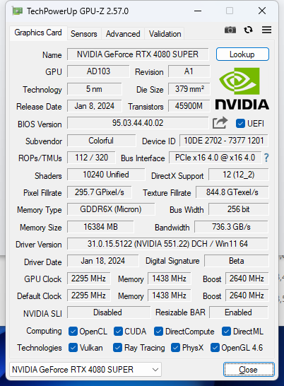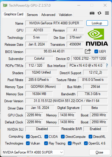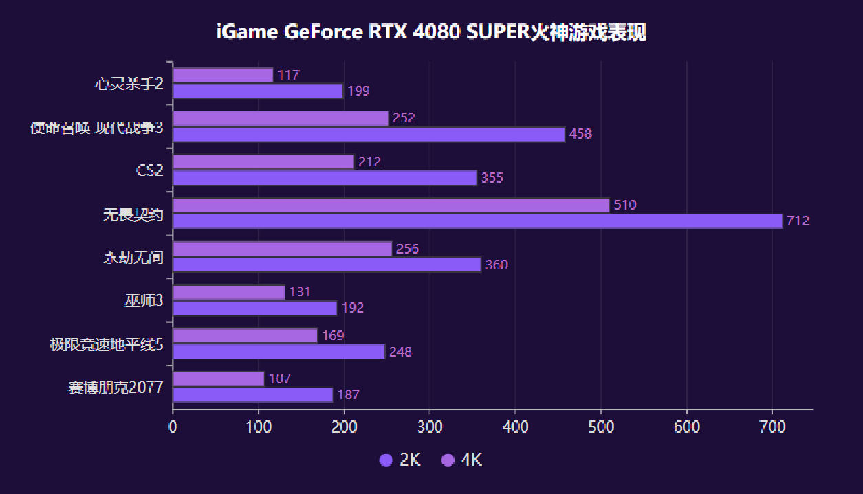 SUPER超能力 RTX40家族迎来重磅新选手 1月举行的CES2024展会上,NVIDIA GeForce RTX 40系列产品家族迎来新成员,RTX 4070 SUPER、 RTX 4070Ti SUPER、 RTX 4080 SUPER三款新品引得业内关注。SUPER代表着超级性能,而今天我们测试的GeForce RTX 4080 SUPER更是堪称RTX 4090/4090D之下的第二把交椅,甚至RTX 4080老用户会感到“背刺”,因为它加量又降价! 七彩虹是国创新生代高端硬件品牌,旗下的iGame品牌同步推出了多款GeForce RTX 4080 SDUPER系列显卡,本次我们测试的iGame GeForce RTX 4080 SUPER Vulcan OC(以下简称iGame RTX 4080 SUPER火神),基于NVIDIA Ada Lovelace架构,采用TSMC定制4N工艺,相比上代实现了高达2倍的性能功耗比飞跃。RTX 4080 SUPER采用AD103-400核心,共有10240个CUDA单元,836个第四代Tensor Core张量核心,121个第三代RT Core光追核心,配备256bit、16GB GDDR6X显存,显存频率达到23Gbps,官方表示游戏性能比RTX 4080快约3%。 (iGame RTX 4080 SUPER火神 GPU-Z 默频 ) (iGame RTX 4080 SUPER火神 GPU-Z 一键超频 ) iGame RTX 4080 SUPER火神显卡是超频版本,基础频率2295MHz,支持一键超频至2640MHz,比公版高出90Mhz,标称TGP也来到了350W,最大460瓦,可以进一步满足玩家们的超频需求,释放显卡潜能。 后赛博时代设计 可分离智屏玩法多多 首先来看看iGame RTX 4080 SUPER火神显卡的设计,提起iGame的“火神”系列显卡,也就是Vulcan系列,大家印象最深刻的莫过锋利的三角元素和金属质感,此次新显卡也不例外,锐利三角经典续写凌厉的赛博利刃。 作为为高端玩家打造的Vulcan系列集大成之作,iGame RTX 4080 SUPER火神采用,漆黑底色尽显沉稳,锋利的金属外骨骼设计突显后赛博时代下机械与生物的融合感。 Vulcan系列标志性的LCD显示屏,进化为“智屏”,人卡交互来到新高度。这块显示屏采用无线磁吸设计,随显卡附赠智屏底座,可分离的显示屏可以通过底部和背部的磁吸触点实现横、竖两种安装方式,还贴心地附赠了Vulcan灯光组件,吸附至显卡上之后,就能随心打造个性化灯效。 全新的iGameCenter软件在人机体验方面大幅提升,界面美观易用,无论是状态监控还是个性化设定,亦或是一键超频功能,都非常容易上手,玩家使用体验得到了质的提升。 散热方面,iGame RTX 4080 SUPER火神使用漩涡散热装置,3个104毫米大口径风扇,使用9翼扇叶聚风镰环风扇,增强聚风效果,提高了风量。双滚珠轴承柔滑顺畅,结实耐用,使用寿命更长。导流型鳍片,拥有更大的间隙因此更利于风流进入,配合9根8mm热管与真空冰片技术实现了高效的热量传导,同时热管与鳍片之间还采用了“回流焊”工艺,优化了散热效果。 供电方面,iGame RTX 4070 Ti火神采用16pin(12+4)供电,与灯光同步接口整合在一起,理线更方便。输出接口方面,提供一个HDMI 2.1a接口、3个DP1.4a接口,最多支持四屏显示。 测试平台 基准性能测试 接下来我们先进行基准性能测试。3DMARK测试共包含Fire Stike、TimeSpy、Port Royal等六个项目。 在3DMARK的测试环节中,Time Spy系列的两个场景中,iGame GeForce RTX 4080 SUPER领先4080约6%以上,光线追踪性能更是高出RTX 3080 Ti多达42%,更强的RT核心带来了显著的性能提升,这对于提升游戏内的光线追踪效果意义重大。 游戏性能测试 最高是3080Ti的两倍! 在游戏性能方面,在几款具有代表性的游戏实测中,游戏设定均为最高画质,开启DLSS和光线追踪,分别测试了2K和4K两种分辨率。 从游戏实测来看,在如此极致的画质设定下,得益于强大的核心性能和高主频,在多款游戏中都取得了120FPS以上的平均游戏帧率,可以说是畅玩4K游戏无压力。 DLSS专项测试 DLSS是GeForce系列显卡提升游戏性能的秘密武器,RTX 40系显卡加入了DLSS 3技术的支持,包括帧生成、超级分辨率和NVIDIA Reflex三个部分,去年发布的DLSS 3.5还引入光线重建技术,显著提高光线追踪效果的保真度和真实感,有助于提升游戏体验。 在3DMARK DLSS 2K分辨率测试中,关闭DLSS的平均帧率为86.19,开启之后平均帧率来到了246.96FPS,提升幅度达到186%!4K分辨率下,关闭DLSS的平均帧率为41.86FPS,开启DLSS之后帧率为157.17帧,提升275%! 在《永劫无间》《使命召唤 现代战争3》等5款游戏中,我们对比了开启/关闭DLSS(超级性能)的帧率表现,在4K分辨率、最高画质、开启光线追踪的设定下,游戏帧率均有明显提升,《使命召唤 现代战争3》《赛博朋克2077》两款游戏中提升幅度都接近1倍,对于游戏流畅性的提升增益显著。即使是在优化相对不足的《心灵杀手2》中,开启DLSS后游戏帧率也有30%的提升。 随着AI视频生成、AI生图等新奇好玩的应用越来越多的出现在游戏玩家的视野,游戏玩家们也逐渐加深了对他们的好奇印象,随着相关软件应用的普及,游戏玩家们也将能体会到AI带来的乐趣,在AI应用方面这一代NVIDIA RTX40 SUPER系列的显卡提升非常显著,可以在3D渲染、视频编辑导出、图形设计等领域发挥重要的作用,因此我们现在在选择显卡的时候,可能需要考虑所选择显卡在AI方面的性能。 七彩虹iGame RTX 4080 SUPER 火神拥有16GB的显存,第四代Tensor Core张量核心,在例如Stable Diffusion AI生图类的创作软件中,可以轻松应对各种复杂的创作需求。 全能4K游戏显卡 作为SUPER系列中的最高阶产品,也是历代80系列中的最强产品,iGame RTX 4080 SUPER火神的强大性能令我们印象深刻。不仅性能比80强,还更便宜,这对于4080卡主来说无疑就是背刺啊。不过,对于用户来说,以更低的价格买到了更强的性能,自然是好事儿。 作为一块4K级别的高性能显卡,RTX 4080 SUPER