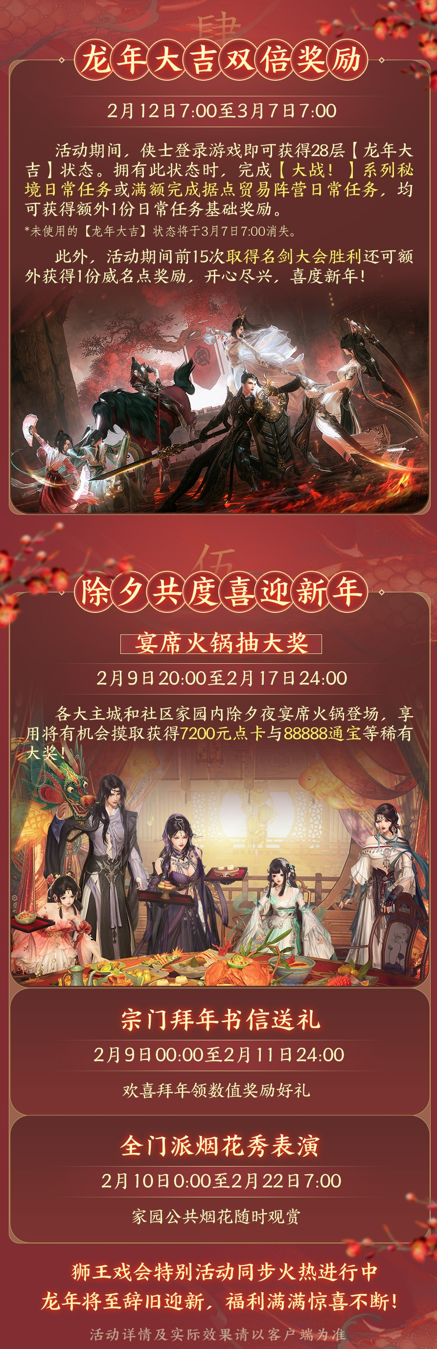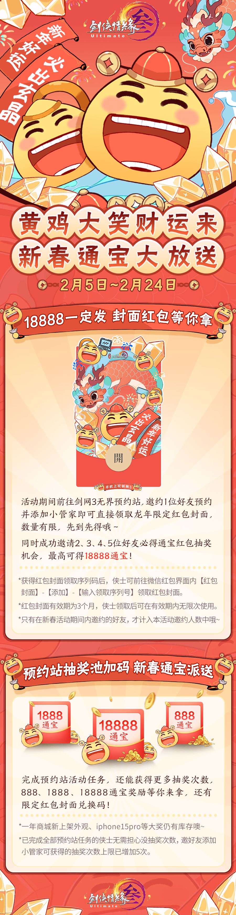春回天地,福满乾坤,《剑网3无界》iOS预订现已开启,预约站更有红包封面和新春通宝相赠!全民免点卡等《剑网3》新春贺喜系列活动第二弹2月9日隆重上线,近期热点一网打尽,福利多多切莫错过! 【剑网3无界AppStore预订正式开启】 iOS上玩剑网3,随时随地畅游大唐!即刻扫码进入AppStore预订《剑网3无界》,不仅将可以持续获取最新资讯,还有机会先人一步抢先体验!无论是在家中电脑前、床上玩手机,还是旅途中使用集成显卡的办公笔记本电脑,《剑网3无界》都将同步支持Windows、安卓、iOS和macOS系统,江湖互通,等你来玩! 我们一直在努力突破自己,追求大唐江湖和现实世界的碰撞与融合。自2019年起,我们就开始了一个新颖且大胆的筹备——打造全新的自研引擎以及全平台旗舰版的产品全貌。而在这个过程中我们也尝试了许多新的领域和引擎的跨平台工作,AR技术就是其中之一。在当时,我们更多是想通过虚拟现实进行摄影和录像,同时加以后期光照处理等技术,从而满足侠士们能够将自己注入了很多心血的游戏角色带到现实场景中来,陪伴大家日常上学、通勤和旅游等等生活瞬间。换句话说,这更像是一个“手机上的幻境云图”,让大家能够和大唐江湖中的另一个“我”更亲密地进行接触和互动。 而如今相关设备上的升级和迭代,让我们具备了更宽广的想象和尝试空间——《剑网3无界》Vision Pro版踏上了新的征程,敬请期待!无界将至,未来启航,《剑网3无界》是剑网3在不断进化的道路上的又一个里程碑,是一个持续性的方向,随时、随地、随心使用不同设备轻松接入同一片江湖! 我们将继续践行恒久努力的理念,持续迭代新的技术对《剑网3》不断优化升级。一步一个脚印,侠士的虚拟资产、社交关系将超越时间不断进化,《剑网3》将永续武侠世界!你在哪里,哪里就是属于你的大美江湖! 【黄鸡大笑红包封面免费送】 财神到财神到,财神开怀哈哈笑,《剑网3》龙年限定红包封面现已喜庆亮相!在设计上,整体以“黄鸡大笑”经典元素为主,传递了新年好运,必出玄晶的祝福。而在细节上,黄鸡大笑举着手中的笔记本与手机,也代表着在今年《剑网3》即将实现手机端、电脑端和笔记本轻量端三端互通!把对龙年的美好祝愿巧妙地结合在一起,喜气洋洋,年味满满! 各位侠士们是否都已经领到了呢?还未拥有红包封面的侠士们现在只需前往【剑网3无界预约站】参与活动,就可以获得这份带着开朗祝福的龙年限定红包封面啦,快行动起来吧! 在领红包封面之余,也别忘了还有惊喜抽奖活动等你来玩,最高可获得18888通宝哦!抽奖互动次数不仅可以通过成功邀请其他亲朋好友获得,还可以通过完成App Store预订《剑网3无界》额外获得一次机会!好运传递,亲友助力,这个暖春我们一同度过! 【春节畅玩免点卡 全民可领猫猫头热气球】 五色狮子,贺庆驱邪,这个春天在《剑网3》你不仅体验有趣而又喜庆的民俗文化,还可以畅享17天全民免点卡,超可爱的“猫猫头热气球”签到送!喜聚度佳节,欢乐不停歇,诚邀众侠士齐赏! “摸摸狮子头,万事不用愁!”成都、扬州、洛阳和长安四大主城擂台处锣声喧天,鼓点阵阵,浓郁的新春氛围跟随醒狮一同来到大唐江湖,开启新春贺喜活动第一弹!弘扬中华优秀传统文化,近距离感受属于醒狮的生动激昂的独特魅力,参与活动还有舞龙玩具【揽云螭】、舞狮玩具【灵猊舞】和春节绘影【墨染·飞龙】等精美奖励,快拉上你的亲友们来一次“接龙”吧! 而在2月2日至3月11日,异彩纷呈的《剑网3》主题线下灯展将亮相唐山南湖春节灯会!精彩不止于此,新春贺喜系列活动第二弹即将打响,更多惊喜福利缤纷来袭! 迎新春,庆良辰,全民免点卡活动2月9日即将开启,从除夕开始17天敞开玩,亲友相聚畅玩大唐!全新奇遇奖励签到送,100%必得“猫猫头热气球”奇趣坐骑【齐云狸】!来一口除夕帮会宴席火锅,享用就有机会获得稀有大奖;点一个福运烟花喜气满满,日常任务更享双倍奖励!新春福利放送不停歇,精彩纷呈年味十足,诚邀诸君齐聚江湖,共赏美景良辰! 有心凌霄云,天穹杳无尽,这蔚蓝无垠的天空,尽头处藏着些什么呢?万灵山庄的颂端云对此满怀向往,如今他遥寄书信有事相求,重酬以谢!《剑网3》新全民奇遇“泛天河”2月9日贺岁登场,活动期间满20级的侠士每日签到开启宝箱,累计7次将100%可触发,超可爱的“猫猫头热气球”新年礼物等你带回家! |