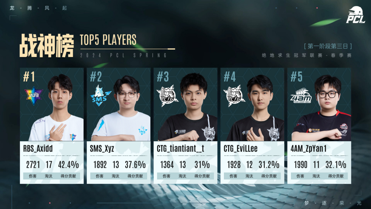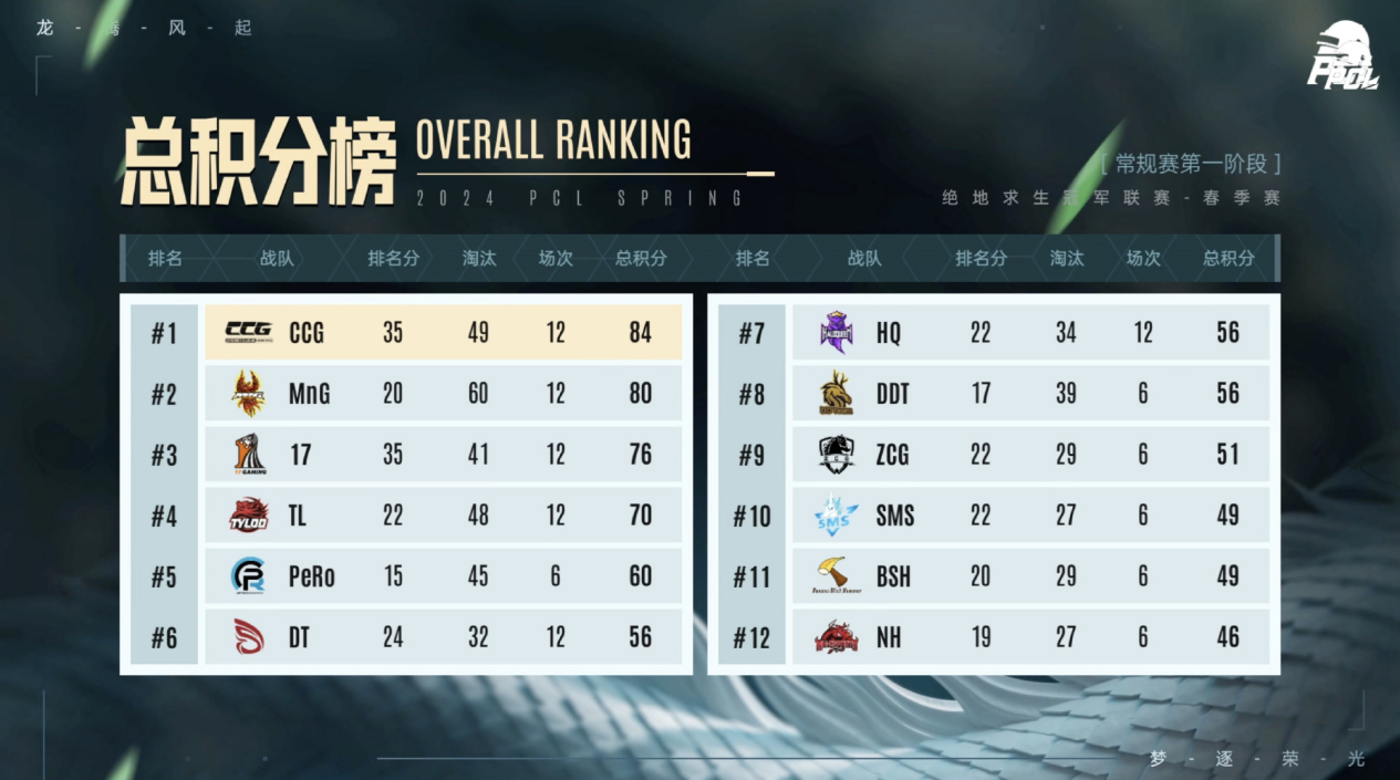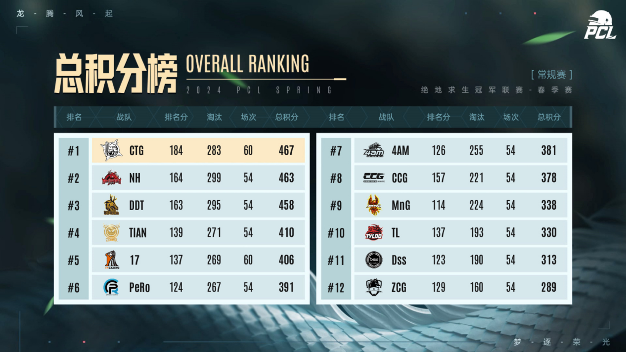 龙腾风起,梦逐荣光!PUBG PCL2024春季赛正在火热进行,在经过长达半个月左右的激情角逐之后,共有16支战队在全新的赛制中脱颖而出,成功晋级季后赛! 在全新的赛制中,所有战队被分成了ABC三组,并进行5轮的单循环比赛。经过五轮激烈的常规赛对抗,最终NH战队、DDT战队和CTG战队分别以506、496、467的总积分位列本次常规赛积分榜前3甲。此外,成功晋级季后赛的还有天霸战队、CCG战队、PeRo战队、17Gaming战队、4AM战队、MnG战队、TYLOO战队、Dss战队、ZCG战队、FTG战队、TBB战队、TSG战队、HQ战队! 在即将到来的5月9日-5月11日的季后赛中,这16支战队将会进行3轮比赛,每轮比赛进行6局。最终根据总积分进行排名,并角逐最终的300万元奖金。那么,在这次的常规赛中,这些战队又有哪些高光时刻,他们的精彩表现又是否会持续到季后赛上呢,让我们一起来回顾看看吧: 在第一轮第一天的前两场比赛中,战况就非常激烈,艾伦格地图接连上演梅花桩刚枪战,首轮BSH通过逐个击破吃下NH成功吃下首鸡,随后SMS和CCG又再度上演了同样的战况,SMS成功吃鸡。值得一提的是,在这场较量中,来自NH战队的MMing还取得了个人累计淘汰突破1400人的成就,这也是PCL史上的第一位。 而在去年各大赛事中,表现非常抢眼的17Gaming战队、TL战队、NH战队在接下来的场次中也终于发力,先后吃鸡,开始展现强者的风范。在第一轮首日的6场对决后,SMS以27个淘汰和49的总积分暂时位列第一。 第二日赛事中,其他战队开始发力,加剧了战况的激烈程度,而17Gaming战队、ZCG战队则在这种对局中成功抓住机会,终于相继吃鸡。 本日比赛后,CCG大力反超,以84的总积分拿下榜首。其中PeRO战队的Aixleft以3010总伤害和19个淘汰,高居战神榜之首。DDT战队的Shen和Cold119分别以3372和2661的总伤害,位居第2和第3。 第一轮的最后一天比赛中,YT战队以满编队员苟到最后,三打三拿下TSG成功拿下首胜。随后的PeRO战队、NH战队在第二场中也再度发起冲锋,但依然时运不济,先是NH在夹击中止步第三,而PREO与DSS的对决也没能讨到好,被DSS夺下本场胜利。NH战队在本日的最后一场赛事中,终于在第八阶段,以三打二淘汰强敌DDT,吃到首鸡。 本日对战后,PeRo战队上演实力反超,以108总积分屈居榜一,NH位居第二。来自RBS战队的Axidd以2721总伤害拿下战神榜第一。 第二轮第一天的比赛中,4AM虽然表现出了强劲的实力,但依然不敌DSS,被其拿下首胜。随后的第2-3场上,接连上演梅花桩对抗,NH和4AN先后吃鸡。但在接下来的4-6场对抗中,这些劲旅没能讨到好,而在第一轮中表现抢眼的DSS战队、CCG战队和MnG战队再次展现了不俗的实力,先后吃鸡。 本日对战后,CCG以150总积分夺冠,来自4AM战队的ZpYan1以2932总伤害拿下战神榜第一。 第二天第一把,4AM虽然进攻势头猛烈,但在进圈时惨遭抽靶淘汰,而17Gaming战队和DDT在刚枪后,DDT的Shen利用闪光弹成功吃鸡。在第二把的激烈碰撞后,TYLOO战队拿下CCG成功吃鸡,NH战队的南南吖和PeRo战队的Cui71则分别获得了个人累计淘汰突破1100人的成就。后续的比赛中,MnG战队表现出强势姿态,先后连吃两鸡。 本场比赛后,MnG也以206的总分高居榜首,同时,其战队成员Xyangi12_SZ以2276伤害拿下战神榜第一。 第二轮第三天的首场比赛,DDT在梅花桩气势如虹,先后拿下CTG和WCG,成功吃鸡。而DDT的表现则是本日中的吸睛点,不仅在其他场次中,都顽强战至第7或第8阶段,不断拿到小分,在第4场对决中还在梅花桩刷新时,拿下ZCG和强势的NH成功吃鸡。最终以144总分成为本日的榜一,来自NH战队的MMing则是以2159伤害夺得战神榜第一。 4月26日,第三轮比赛正式开打。TSG首战出师大捷,拿下强敌YL,成功吃鸡。随后的战事中,CCG战队表现不俗,成功吃鸡两把,为自己累计了不小的优势。在本局的最后一把对局中,TBB战队也终于以三打二拿下FTG,成功在比赛中吃到首鸡。 本日DDT以261高分暂居积分榜一,来自PeRo战队的Cui71以2518总伤害成功获得战神榜首。 第三轮第二日里,DDT再次延续优秀的表现,率先吃下首鸡。但随后天霸战队、NH战队也有不俗表现,特别是天霸77的手雷狂轰战术,收掉TBB独狼,让很多人眼前一亮。本日六场赛事后,DDT继续扩大积分优势,以304继续领跑,NH开始迎头赶上,冲到第二名。来自天霸战队的77成功获得了本局的战神榜榜首。 第三轮的最后一天开打后,PeRo战队、17Gaming战队、NH战队三大强队表现抢眼,先后吃鸡,特别是NH战队以强势表现直接吃下三鸡,拿下了大量的分数点,直接成为本局总分榜的榜一大哥。同时,其成员MMing再度成为战神榜榜一。 第4轮对弈在4月30日激情开打,PeRo战队在本局中表现尤为出色,先后淘汰了WCG、DT、TSG等强敌,吃下两鸡,将自己的积分排名从第6一跃升至第3名,而DDT战队则是以之前的优势继续领衔,同时其成员Shen再度拿下战神榜榜首。 第二日比赛开打后,天霸战队一骑当千,率先吃鸡。随后,JSG、CTG、DT和BSH也有不俗的表现,在决赛圈各自解决对手后相继吃鸡。特别是BSH,在第5-6把,以精湛的枪术连续获胜。 这一日后,NH虽然没有吃鸡,但依然有不错的积分进账,最终以393分挤下DDT,占领榜首。而CTG战队的EviLLee则是以2422分拿下战神榜一。 第四轮最后一天对决,CCG和TBB上演极限对换,并成功淘汰对手吃鸡。但在后续的场次中,TBB也成功证明了自己的实力,击溃强敌DDT吃鸡。而CCG则是以两胜的好成绩,成功将自己的积分排名挤进了前5。DDT则是再度反超NH战队,重回榜首。此
