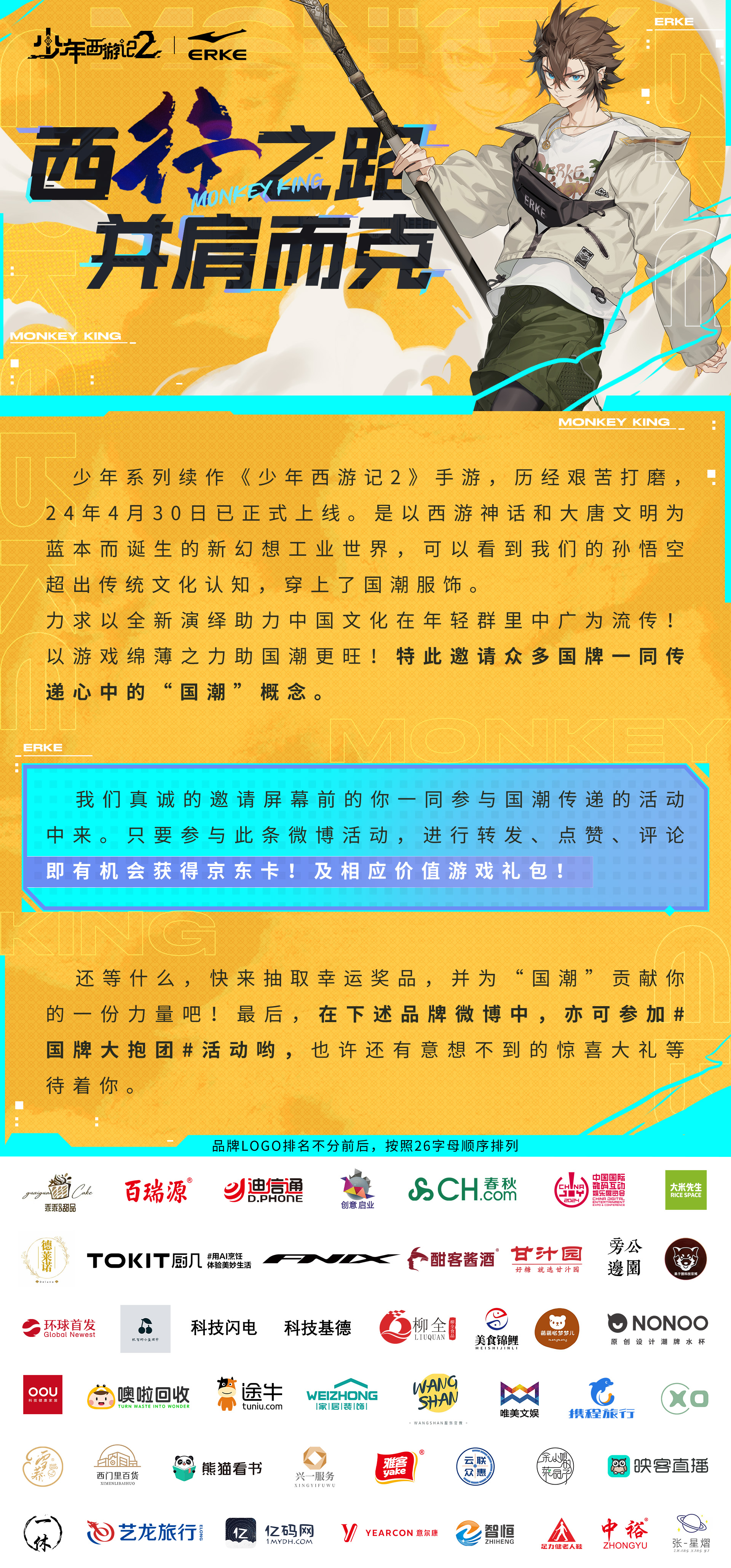 游族网络旗下少年系列续作《少年西游记2》手游以西游神话和大唐文明为蓝本,创造了一个崭新的幻想工业世界,将传统与现代相结合。其中,孙悟空以全新形象出现,穿着富有国潮风格的服饰,超越了传统文化的认知边界。 《少年西游记2》手游x鸿星尔克联动皮肤“行者无双” 力求通过全新的演绎方式,在年轻群体中广泛传播中国文化,游戏不仅展示了中国神话故事的独特魅力,还通过现代元素的融入,使得传统文化更具现代感和时尚气息。这种融合旨在推动中国文化在青年一代中的传承和发展,让更多人了解和喜爱中国传统文化。 《少年西游记2》手游人物立绘 同时,《少年西游记2》还致力于助力国潮文化的兴起。通过游戏的宣传推广,积极邀请众多国内品牌共同传递“国潮”理念,强调传统文化与现代精神的结合。游戏希望以自身的力量,促进国潮文化的繁荣发展,引领更多人走进这一充满活力和创意的潮流文化之中。 联名鸿星尔克,打造国潮风尚 4月30日,《少年西游记2》手游宣布与鸿星尔克正式展开联动合作,推出“行者无双”联名系列。该系列包括鞋子、衣服以及联名礼盒,并于当日在鸿星尔克天猫官方旗舰店平台进行发售。《少年西游记2》手游也为玩家带来游戏内“行者无双”定制服饰、鞋子及“筋斗云”定制法宝。公测当天更是开启“鸿运齐天”定制活动,完成累积登陆及活跃任务即可免费获得联名法宝筋斗云和联名孙悟空皮肤-行者无双,让玩家尽情享受游戏乐趣。 与新民晚报共探国货潮流话题 《少年西游记2》手游与知名媒体《新民晚报》联手打造“潮变:破圈正当时”主题栏目。该栏目将深入街头,采访各界路人,洞察市场对国货潮流的认知与态度。更有上海市轻工业协会秘书长现身说法,解读国货潮流趋势,聚焦国货品牌的发展脉络及挑战。同时,借助近十家优秀国货企业的参与,栏目探讨这些企业在国货潮流中的坚持与努力,呈现他们一直秉持的理念与创新成果。 携手国货,我们期待屏幕前的你支持与参与。这不仅是一场媒体与游戏的跨界合作,更是对国货潮流发展的深度探讨。每一个声音都将汇聚成国货潮流的动力源泉,在这个充满创意与活力的时代,共同见证国货由内而外的焕发与转变。 携手众多国牌助力国货发展 《少年西游记2》手游宣布与众多国内知名品牌合作,共同打造“国牌大抱团”微博联动活动。这一活动分为两个精彩部分:第一弹,用户客通过参与《少年西游记2》手游官方微博和联动品牌官方微博活动进行互动,助力国货。第二弹更富有趣味性,《少年西游记2》手游中悟空即将踏上西行之旅,而他需要各位用户的帮助选择旅行必备国货。游戏联合10家国货品牌开展微博联动活动,这些品牌的产品将成为悟空旅途中重要的一环。有的将陪伴悟空历经千辛万苦,有的能够提供路程规划、酒店预订服务,还有的则提供装备衣物、食物和交通工具等,确保悟空旅途无忧。用户不仅能加深对国货的认识,还有机会赢取丰厚大奖。 活动旨在提升国货品牌的认知度,让更多国货爱好者从生活的方方面面了解各类国货品牌。这样的互动不仅促进了中国国货的发展,也为国货潮流增添新元素。让我们共同为国货的高质量发展添砖加瓦! 《少年西游记2》手游联手众品牌开展“国货大抱团”活动 《少年西游记2》手游“国货大抱团”活动第二弹 |