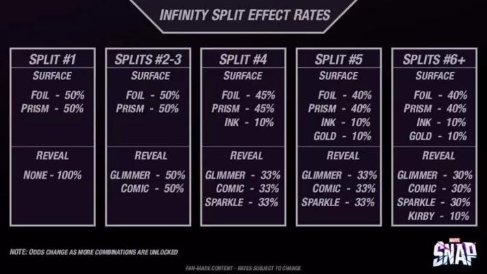 这期将介绍新人们最关心的问题:如何合理使用现有资源以及变体的获取与分裂。 (本文所有内容基于当前测试服) 资源获取及使用 ①金块 金块是这个游戏里最万能的,你可以用金块买到任何东西。你可以通过氪金、通行证、天梯等级奖励、征服商店等途径获取金块,但是切记不要乱用!!!虽然金块什么都能买,但是请什么都不要买(不是)。如果你是0氪或者微氪,我建议攒金块等商店刷新买划算的金块礼包(价格2000金块到7500金块不等);如果你是中氪,我建议用金块购买礼包或者商店里好看的变体;如果你是氪佬,那我给不了你建议爱咋花咋花。 ②蓝点 蓝点是这个游戏的硬通货。你可以通过游戏内的每日任务及各种活动等地方获取蓝点。前期哪张卡能升级升哪张,后期卡牌变体多了之后再选择自己喜欢的卡牌升级即可。根据目前测试服内容国服的快速升级还没改版,因此切记切记切记不要购买快速升级!快速升级等于是用蓝点买粒子,而粒子是可肝无上限的! ③强化因子 强化因子即粒子,绿点,绿豆。你可以通过对战获得粒子,每轮对战获得的粒子数为对战轮次(比如5回合就得5个粒子,4回合以下无粒子)。粒子的获取为纯随机,卡牌的升级所需粒子数分别为5、10、20、30、40、50。 ④收藏家代币 代币是这个游戏获取途径最少的。你可以通过收藏树的箱子或是购买礼包获取。代币可以用来购买卡牌,其中3池卡售价1000代币(随机开取),4池卡售价3000代币,5池卡售价6000代币,终极变体售价5000代币。只推荐新手购买自己想要的4、5池卡,3池及终极变体那都是富哥考虑的事。 变体系统 ①变体稀有度 终极逆转是卡牌对战游戏(×),变体收集游戏(√)。变体的稀有度分为稀有<超级稀有<焦点变体<礼包变体<终极变体。其中稀有变体售价700金块;超级稀有变体售价1200金块;焦点变体为紫箱子开取,会在一年后返场进商店,售价目前未知;礼包变体为金块或现金购买,目前从未返场;终极变体售价5000代币。各稀有度变体并不特效区别,其划分完全由卡面帅不帅及画师知名度来决定。 ②变体获取途径 稀有变体与超级稀有变体可通过商店每日刷新购买。其中商店还售有定价800金块的高级神秘变体,千万别买!!!再次重申,该游戏没有随机,所有看似随机其实都是固定的!高级神秘变体9个为一组,每组中有且只有6个稀有变体及3个超级稀有变体,因此不要想着当赌狗,你永远不可能连续开出好几张超级稀有变体。而终极变体在代币商店8小时轮换一次。终极变体目前并无特效(特效还在设计师画的饼里),除非特别喜欢不建议购买,因为5000代币真的太贵了。值得一提的是,如你通过礼包等途径获取了还未拥有卡牌的变体时,你是可以使用该卡牌的,但在后续开箱过程中依然会开出其本体。 除了商店之外,收藏树的金箱子有概率开出稀有变体,通行证50级后的通行证宝箱也有5%概率开出稀有变体。 ③卡牌分裂系统 当你获取了卡牌与变体后便可用蓝点与粒子进行升级,升至无限后便可以进行一次卡牌分裂,分裂会为该卡牌添加新的背景与粒子特效。其中背景特效分为4类:闪箔,棱镜,墨色,炫金。粒子特效分为四类:格调,微光,星尘,爆裂。每种粒子特效又有如下颜色:黑、彩虹、金、紫、红、蓝、白、绿。各种背景及粒子特效分裂概率如下: 总结:墨色只能在分裂第四次后会出,炫金只能在分裂第五次后会出,爆裂只能在分裂第六次后会出,三者概率皆为10%(分裂次数计算为同卡牌不同变体累计)。而颜色中黑色最为稀有,彩虹与金色其次,剩下的紫、红、蓝、白、绿概率都差不多。 通过排列组合我们可以知道,一张卡的分裂总共存在着129种可能(含第一次分裂只有背景无粒子特效),当你集齐一套全稀有分裂卡组时将对对方造成500%的精神攻击。附本人的全黑白海拉(我没有夹带私货啊)。 以上便是漫威终极逆转的基础玩法。后面本人还会再出一期进阶篇讲解,如何判定先后手、如何合理构筑一副套牌、如何更大概率刷出想要的强化粒子等,希望能对想入坑或者刚入坑的小伙伴们一点帮助。 |