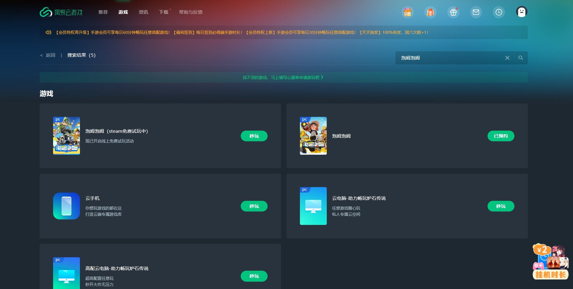 鹰角买断制游戏《泡姆泡姆》最终定价及发售时间还没定,但免费试玩版已经开放。这是一款充满合作与冒险精神的多人平台游戏。玩家将变身为勇敢的小战士,与好友们一起踏上探索神秘星球的旅程。在这个过程中,你们将面对各种各样的挑战,运用各种神奇的道具和独特的技能,解决重重谜题,击败形态各异的敌人,为世界带来希望和新生! 你可以选择使用网易云游戏来畅玩《泡姆泡姆》。无需下载游戏,不占内存,只需一键登录,即可随时上线游戏。网易云游戏同时支持手机(安卓和iOS均已支持)、PC(网页&客户端,尽享模拟器般体验,支持Mac&Windows系统)、TV3种游戏方式,无需下载即开即玩,非常方便。还能开小号和自己双人组队,赶紧试试吧! 泡姆泡姆试玩版配置要求介绍 本次试玩支持Xbox、PS DualSense、PS DualShock手柄,游玩设备有一定配置要求 最佳体验配置 - 画面预设极致画质 该配置可支持2560x1440 (2K)分辨率以60 fps运行极致画质 <显卡> NVIDIA GeForce RTX 3060、AMD Radeon RX6600 XT <内存> 8 GB <操作系统> Windows 10/11 64-bit <存储空间> 预留 15GB 及以上可用空间,推荐使用SSD 推荐配置 - 画面预设高画质 该配置可支持2560x1440 (2K)分辨率以60 fps运行高画质 <显卡> NVIDIA GeForce RTX 2060、AMD Radeon RX5700 XT <内存> 8 GB <操作系统> Windows 10/11 64-bit <存储空间> 预留 15GB 及以上可用空间,推荐使用SSD 最低配置 - 画面预设低画质 该配置可支持1920x1080 (1080P)分辨率以30 fps运行低画质 <显卡> NVIDIA GeForce GTX 750Ti、AMD Radeon RX 550 <内存> 8 GB <操作系统> Windows 10/11 64-bit <存储空间> 预留 15GB 及以上可用空间,推荐使用SSD 如何在网易云游戏上游免下载、快速玩到《泡姆泡姆》? 一、打开网易云游戏和启动《泡姆泡姆》 1.打开网页(MAC请使用Safari)搜索“网易云游戏”,找准网易云游戏官网进入; 2.游玩《泡姆泡姆》 直接在搜索框搜索《泡姆泡姆》,直接点击“秒玩”,即可启动。 除此之外,网易云游戏还可流畅运行《原神》、《崩坏:星穹铁道》、《崩坏3》、《明日方舟》、《第五人格》、《蛋仔派对》、《永劫无间》、《燕云十六声》等多款热门游戏,新上线的手游和电脑游戏也会同步上架。 完成以上操作后,你就能尽情享受《泡姆泡姆》带来的乐趣啦! 【关于网易云游戏】 网易云游戏可在Windows、Mac、iOS(iPhone&iPad均覆盖)、安卓、TV上运行,有千款手机游戏和3A大作电脑游戏,深受玩家好评。 网易云游戏突破了端和设备的限制,不用安装,即点即玩。用户可以在不同设备上游玩手机游戏和电脑游戏,而且完全不受设备配置和容量限制,不占空间,不耗电,不吃配置,不发烫,任何设备都可以随心所欲地免下载安装游玩大量游戏。 官方微博:网易云游戏 微信公众号:网易云游戏 |