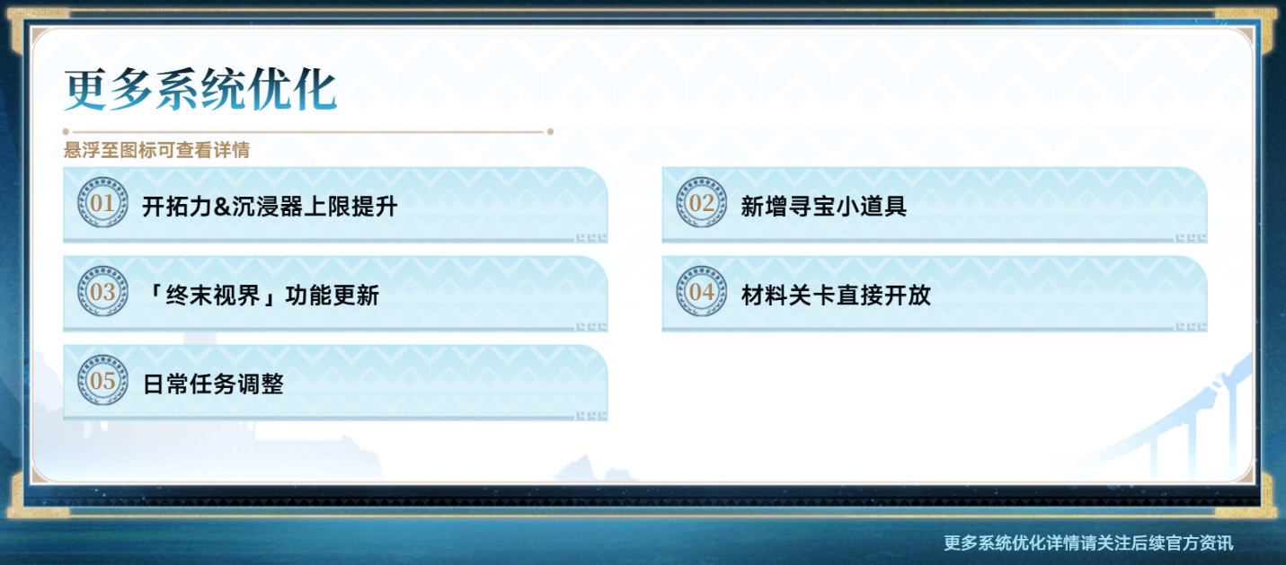 导语 《崩坏:星穹铁道》3.0版本「再创世的凯歌」于1月15日开启,全新星球翁法罗斯上线,三重命途交汇之地、崭新冒险之旅即将拉开帷幕。本次更新不仅有主线开拓任务、众多新玩法及全新地图探索体验,还有超多福利及游戏优化同步上线。 银河幸运星活动开启,50万星琼豪礼等你领取! 游戏将在1月27日至2月2日开启为期7天的「银河幸运星」活动,玩家选择参与抽奖,则每次有概率获得600星琼和50星琼,还有机会赢取50万星琼大奖;也可选择每天稳定领取保底的100星琼。7次机会,不要忘记来游戏中开启属于你的欧皇时刻! 福利加码!登录可领取20连抽+三月七时装 1月15日版本更新后,不仅有签到7天获取的10张「星轨专票」以外,还可额外获得迷迷为开拓者一次性带来的「星轨专票」*10和「变量骰子」。为开拓者前往新星球增添助力。 此外,在3.0版本期间登录游戏并解锁【角色】功能,即可免费领取「三月七·存护」的时装「冬去煦至」!活动结束后,该时装将上架商店。获得时装后还可获得时装对应头像。 超多系统优化更新,进一步满足开拓者减负需求 3.0版本更新提升了开拓力和沉浸器的上限,开拓力由原先的240→300;沉浸器由8个→12个; 新增寻宝小道具,让开拓者更便捷地在场景寻找离自己最近的宝箱; 「终末视界」功能也迎来更新,支持开拓者在尚未完成前置开拓任务的情况下提前体验某个世界的剧情。如开拓者在完成开拓任务「雅利洛-VI」-「静静的星河」后,即可在导航页面选择「匹诺康尼」「翁法罗斯」,提前解锁并进行体验,真正实现自由灵活选择开拓目的地。 遗器系统优化方面,新增道具「遂愿尘脂」,合成遗器时搭配「自塑尘脂」,即可定向遗器副属性词条;同时还新增了上文提到的「变量骰子」,这个道具可以在不破坏原遗器词条的基础上,对强化次数进行重新随机分配,还可自由选取重新分配前后的结果。还有智能装配系统、培养指引系统上线,能大幅降低开拓者角色培养门槛。 以上就是为大家带来的3.0版本福利及优化相关情报,还有新角色及地图场景等更多精彩内容等各位开拓者前往游戏内体验。全新银河冒险之旅即将开启,期待大家能在游戏内留下独一无二的开拓记忆。 |