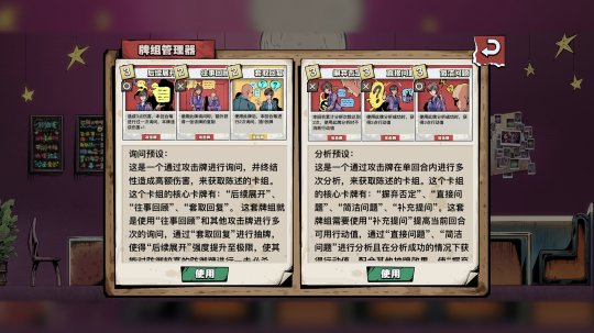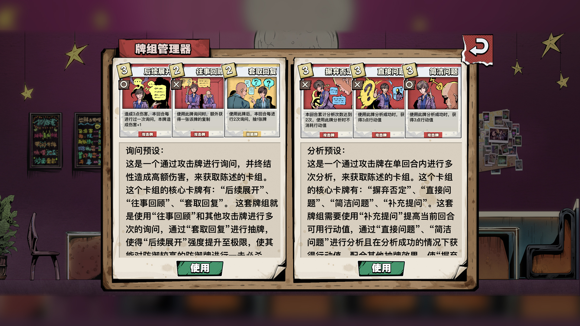 “游·见”是ChinaJoy与Game Connection联合推出的游戏人专访栏目,我们将聚焦在游戏开发者、发行商、游戏产品上,讲述游戏背后的故事,探究每个创意是如何诞生的,分享对行业的见解和观点,发现那些不为人知的精彩瞬间。 神探饭店制作组访谈 当美式漫画的鲜明风格遇上严谨的警用询问技巧,会碰撞出怎样的火花?独立游戏《卡牌侦探》给出了一个令人惊喜的答案。这款由神探饭店制作组打造的创新作品,将刑侦询问过程巧妙地转化为非对称卡牌对战,让玩家在充满张力的对决中体验追寻真相的乐趣。 在这个独特的卡牌世界里,玩家不再追求击败敌人,而是要通过精准的提问技巧击破证言防御。游戏将现实中警用询问的"圈叉理论"融入卡牌机制,用"圈"代表实话,"叉"象征谎话,每一次出牌都是一次心理博弈。制作组从美国警察询问教材中汲取灵感,将真实的询问技巧转化为富有策略深度的卡牌对战,让玩家在娱乐中掌握辨别谎言的实用技能。 Q:请简单地介绍一下神探饭店制作组以及游戏《卡牌侦探》吧! A:《卡牌侦探》是一款以非对称卡牌对战为主要玩法,美式漫画美术风格的文字冒险卡牌游戏。我们是一个非常小型的开放团队,这也是我们第一款游戏。 Q:很多侦探故事里,破案往往靠“天才推理”或“超能力观察”。你们为什么选择用“警用询问技巧”作为切入点,并把它做成一款卡牌游戏? A:因为在“推理”和“超能力”领域里,有太多的神作了,比如《逆转裁判123》,《幽灵诡计》等等,对于我们这样一个又新又小的团队来讲实在是太大的挑战了。所以我们想怎么能把项目做得相对更“实”一点。在寻找灵感的时候看到了一个美国警察的询问教材,看完觉得真是太有趣了,就决定用这本书里的内容作为切入点了。然后我个人比较喜欢卡牌游戏,就选择了卡牌。当时也有人提醒我:卡牌游戏的数值可能是个很大的坑,但当时的我还是过于的“普通但又自信”了。 Q:游戏的核心是“非对称卡牌对战”。能否为我们描述一下,一场标准的“询问对决”是怎样的流程?它的紧张感和策略性从何而来? A:在美国的询问体系里,调查者的的目的是非常简洁明确的,就是找出描述案情时“说谎”的人。因为只有真正的凶手才会在描述案件时无法说实话。但是,“说谎”这个行为除非产生了事实性的矛盾,否则是很难被分辨的。不过因为“说谎”而产生“焦虑”是相对容易识别的。因此调查者会使用各种提问的方法,提升凶手“说谎”的频率,并且尽可能通过刺激来调动他的情绪,从而分辨出谁是那个“说谎”的人。 因此对于调查者来说,他其实是没有什么紧张感的,反而是被询问的对象才是紧张的。而调查者要采取最能激发询问对象“说谎”行为和“焦虑”症状的提问方法,反复地刺激他,并尽可能排除与案情无关的说谎行为,最终确定他的嫌疑。 所以在我们的游戏里,都是完成一场战斗之后,被询问者会说出一段真相,代表着他放弃了说谎,吐露了实情。 Q:玩家的目标不是击败敌人,而是击破证言、防御,拿到陈述。你们是如何把“警用询问”翻译成一套有趣的卡牌战斗规则的? A:首先我们先把调查部分中最重要的,被调查者的“实话”和“谎话”抽象成了“圈”和“叉”两种符号,然后把在真实询问中,被询问对象的语言、神态、动作特征,做成了防御卡牌,并且和“圈”“叉”进行了结合,表现出焦虑特征的防御卡牌就有比较多的代表谎话的叉,而表现出放松特征的防御卡牌就有比较多的代表实话的圈。而在调查者这边,我们把用来提问的方式方法做成了攻击卡牌,而且尽可能把现实中针对对应动作特征的提问方式还原到对应的攻击卡牌上。也就是说,现实中如果被调查者呈现出的动作特征最适合用某种方式提问,那么游戏中这种提问方式的攻击卡牌进攻该动作特征的防御卡牌时往往有比较好的效果。 Q:游戏中有“询问”(击破防御)和“分析”(猜符号)两种获取陈述的方式。设计这两种路径是出于怎样的考虑?它们分别代表了推理中的哪种思维? A:这两种路径还是来自于现实得询问中可能会采用的方式。“询问”来击破防御这个路径类似现实中给被调查者制造更多焦虑的手段,例如通过虚构一个事实来逼迫被调查者说谎而使其更焦虑等等。而“分析”来猜符号的这个路径则类似仔细分辨被调查者的每一个行为特征所表现出来的焦虑是否是来自于和案件相关的谎言。 Q:独特的“漫画风格”为游戏定下了怎样的基调?在表现悬疑感和角色情绪时,美术提供了哪些帮助? A:我们的美术原本就是画漫画的漫画家,自己又很喜欢游戏。我们在上一个项目中,因为美术风格和精度得到了比较好的评价,所以我们这一次又向前走了一步,做的更大胆了一些。为了平衡画面的精度和创作的难度,我们采用了美漫大面积阴影和调子的绘画方法,一方面这种大面积的纯色降低了绘画的难度,一方面又可以塑造一种明显的光影对立的感觉和悬疑的压抑的氛围。 Q:主角宫美雪和侦探芦笛,他们分别代表了追求真相的哪种力量?您如何让玩家与他们产生共鸣? A:宫美雪是个新人,是个刚从规矩的世界里走出来的人,所以她是相对追求过程正义的人,而芦笛已经走进地下世界了,是个野人,所以他时一个纯粹追求结果正义的人。在这个故事里,我最想塑造的是芦笛这个某种意义上的“反派”,因为一般来说,反