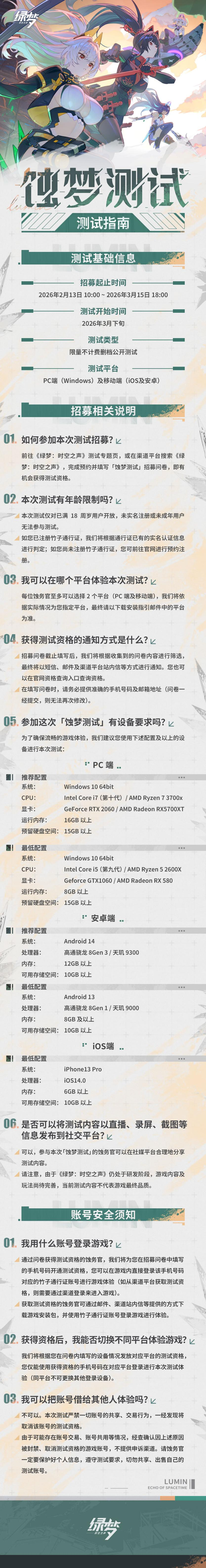 蚀务官,久等了,欢迎回到侵蚀管理局!今日(2026年2月13日),3D二次元横版ACT游戏《绿梦:时空之声》「蚀梦测试」招募正式启动,本次「蚀梦测试」为限量不计费删档测试,蚀务官可通过填写招募问卷、参与预约抽奖等多种途径获得测试资格。 「蚀梦测试」招募开启,参与预约赢外设豪礼 在新的一年,《绿梦:时空之声》将迎来全新的「蚀梦测试」,本次测试招募于2026年2月13日10:00至2026年3月15日18:00期间进行。在此期间,蚀务官可前往《绿梦:时空之声》官网测试专题页,以及哔哩哔哩、TapTap、好游快爆渠道平台搜索关键词《绿梦:时空之声》,完成预约并填写测试招募问卷,即有机会获得测试资格。招募结束后,将根据玩家在问卷中填写的手机号码,以邮件、手机短信、渠道平台站内信等方式进行资格通知。 此外,即日起至3月27日,在哔哩哔哩、TapTap及好游快爆平台测试招募活动期间,各位蚀务官参与招募活动并完成预约,每日都有机会抽取Switch 2、RTX 5070显卡、高端游戏外设以及游戏限定周边等丰厚实物奖励,这也是《绿梦:时空之声》为各位蚀务官准备的新年第一份“测试贺礼”,千万不要错过! 值得一提的是,本次「蚀梦测试」不限制玩家进行直播、录屏或截图,参与测试的蚀务官可以在社媒平台合理地分享测试内容。但关于账号安全须知,获得资格的蚀务官仍需遵守同测试平台不可更换其他登录设备的要求,更严禁一切账号的共享/交易行为哦。 新宣传PV震撼发布,探索无界,战斗高燃! 伴随着「蚀梦测试」招募活动的正式启动,今日《绿梦:时空之声》同步释出全新实机宣传PV,以极具张力的视听语言展现游戏在探索与战斗两大核心维度上的成熟打磨。 在PV中,玩家在陷阱、管道与悬浮平台间自由穿梭,解谜、跳跃与隐藏机关交织,凸显丰富的探索乐趣。随后,多位全新角色华丽战斗的实机演示,视觉冲击力十足,直观传递出《绿梦:时空之声》带给玩家的“探索×战斗×演出”三位一体的沉浸式体验。 测试内容全面升级,新角色、新地图、新活动亮相 相较于2025年9月开展的「溯梦测试」,《绿梦:时空之声》「蚀梦测试」在角色阵容、系统功能与游戏内容层面均实现显著扩充与优化。本次测试将上线全新可操作角色“布雷兹”;主线剧情亦迎来重要扩充——优化叙事节奏,新增“纽特基地”新地图及第二章(第二章· 故土之悼)部分内容;测试期间还会开放多项免费活动,包括“长夜旅途·奥鲁姆要塞”、“克瑞通基础版”及“御能检验·能力测试”等,配合更完善的新手引导,新老玩家均可更加顺畅地体验本次测试内容。 同时,在整体表现层面,游戏迎来一次视觉与交互体验的集中升级。全新设计的UI界面与专属字体,提升信息辨识度与美术统一性;副本界面重构布局,操作路径更直观高效;“蚀务手册”系统进一步完善,为玩家提供更清晰的角色成长指引;装备养成系统亦进行反馈强化,降低理解门槛的同时增强成长获得感。 回望「溯梦测试」,玩家热情高涨,口碑持续发酵 2025年9月下旬,《绿梦:时空之声》「溯梦测试」开启,吸引了许多二次元动作游戏爱好者踊跃参与。凭借其独特的近未来废土×多维空间世界观设定、扎实的横版ACT打击感以及类银河恶魔城式的地图设计,游戏在玩家社群中迅速积累起良好口碑。多位参与测试的玩家在社媒平台上表示:“操作手感远超预期”“美术风格极具辨识度”“地图设计让人很有探索的欲望,期待正式上线”。 在「溯梦测试」期间,许多参与测试的蚀务官都热心的给出反馈意见与想法,这些反馈的问题将在《绿梦:时空之声》后续测试中逐步得到完善和改进。 即日起,《绿梦:时空之声》「蚀梦测试」官方招募通道便已开放,欢迎感兴趣的玩家前往游戏官网或哔哩哔哩、TapTap等平台参与预约招募,测试席位有限,期待你以“蚀务官”的身份,再度启程,共赴这场穿梭于废土霓虹与时空裂隙之间的冒险之约! 关于《绿梦:时空之声》 《绿梦:时空之声》的故事发生在一个被“大侵蚀”灾难摧毁的近未来世界。玩家将扮演“侵蚀管理局”成员——“蚀务官”,踏入裂隙,穿梭于霓虹都市、辐射废土与远古秘境等,在裂隙中对抗侵蚀、守护文明火种。 Ps:「蚀梦测试」详细测试指南一图流如下: |