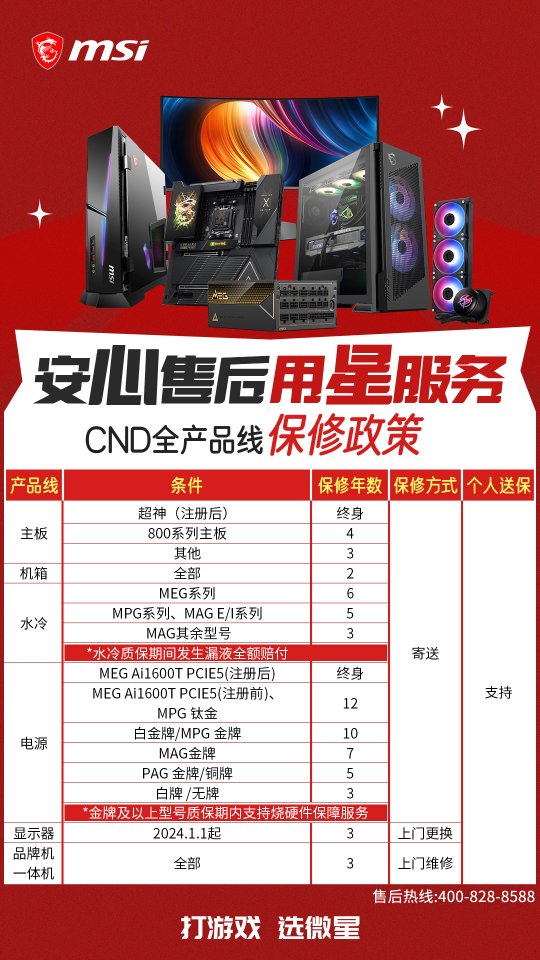 近日,专业电脑硬件品牌MSI微星科技正式宣布对旗下主板、水冷、电源、机箱、显示器、品牌主机及一体机产品线售后保修政策进行重磅升级,进一步提升用户的售后体验和产品保障力度。此次调整涵盖保修年限延长、保障服务升级以及个人送保全面支持,充分体现了微星对产品质量的信心和对用户负责的态度。 主板:800系列率先延保至4年,支持个人送保 微星主板产品线此次迎来重大调整,800系列主板质保时间从原来的3年延长至4年,其他系列主板仍保持3年质保。所有主板产品均支持个人送保服务,方便用户直接联系微星进行售后处理,简化流程,提升效率。 水冷散热器:漏液包赔服务升级,质保期内全额赔付 水冷产品线在此次政策升级中备受关注。微星明确了不同系列水冷的保修年限: MEG系列:6年 MPG系列、MAG E/I系列:5年 MAG其余型号:3年 更值得关注的是,水冷散热器产品在质保期内发生漏液问题,将享受全额赔付服务,让玩家在使用高端水冷散热时彻底免除后顾之忧。 微星电源产品线按系列和认证等级制定了差异化的保修政策,并特别推出“烧硬件保障服务”: MEG Ai1600T PCIE5(注册后):终身质保 MEG Ai1600T PCIE5(注册前)、MPG钛金:12年 白金牌/MPG金牌:10年 MAG金牌:7年 PAG金牌/铜牌:5年 白牌/无牌:3年 金牌及以上型号在质保期内均支持烧硬件保障服务,为用户的关键硬件资产提供更全面的保护。 机箱与显示器:保修期明确,显示器支持上门更换 机箱:全系列产品统一提供2年质保。 显示器:自2024年1月1日起购买的产品,享受3年质保,并支持上门更换服务,大幅提升了显示器的售后便利性。 品牌机与一体机:整机3年保修,上门维修更省心 微星品牌主机及一体机全系列产品同样享受3年质保,并提供上门维修服务,用户无需自行送修,售后团队将主动上门解决问题,真正实现“售后无忧”。 此次政策升级,微星明确所有产品线均支持个人送保,用户可直接通过官方渠道进行售后申请,减少了中间环节,提升了处理效率。如需了解更多详情,可查阅微星官方账号平台或拨打微星售后服务热线:400-828-8588。 |