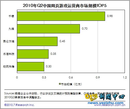中国网页游戏运营商市场规模TOP5 艾瑞分析认为: 网页游戏运营商所承受的市场压力大于以多人在线游戏为主要运营产品的网游运营商,网页游戏产品的运营成本虽然不高,但是随着市场的发展,同类产品想要获得玩家的认同,其需要付出的营销成本会不断增大,网页游戏市场规模TOP5运营商均出现不同程度的收入减少。 |
