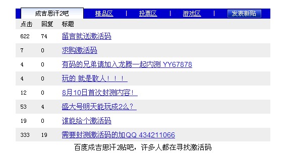 条幅揭秘玩家索要《成吉思汗2》激活码(视频截图) 据了解,《成吉思汗2》本次封测发号不足1万枚,而全国要号者却超过百万,供需出现严重不平衡的现象。自8月6日开放首测激活码发放当天,就出现激活码难求的局面。许多玩家直接打电话询问麒麟公司客服,索要激活码。而在网上关于《成吉思汗2》激活码的交易也开始升温,有人已经将激活码炒到了上千元。游戏激活码也出现了有价无市的场景,有钱也不一定能买到激活码,需要提前预订。 百度成吉思汗2贴吧,许多人都在寻找激活码 今日《成吉思汗2》准时开启首次删档测试,而麒麟游戏并没有增加激活码的计划。在麒麟游戏看来,此次《成吉思汗2》只不过是进行一次封测而已,其最主要的目的是为了对游戏进行一次检验,因此没有必要开放更多的激活码。而且如果激活码开放过多,也会增加服务器的负担,影响玩家的游戏体验。在业内人士看来,之所以出现这种激活码难求的场面,最重要的是在于玩家的好奇心,对于一款新游戏,资深玩家都希望能第一时间进行体验,以便于对游戏作出评判。在这些争抢激活号的玩家之中,其实有许多都是游戏从业人员,他们本身对游戏就非常关注,参与新游戏的测试并作出判断,这也是他们的职业习惯。对于广大《成吉思汗2》的普通玩家来说,没有必要一定凑热闹,可以耐心等待《成吉思汗2》公测的到来。 |