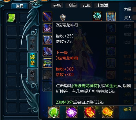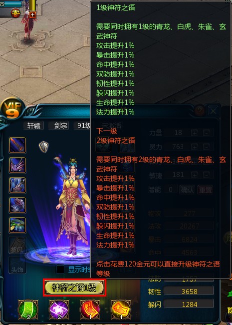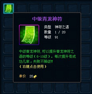 通过藏宝图“挖宝”有一定的几率获得“神符碎片”这个稀有道具。集齐足够数量的玩家可以将神符碎片合成圣兽赋予神力的稀有极品道具“神符”激活圣兽赋予的神力。 神符介绍 神符又分为“青龙、白虎、朱雀、玄武”四种类型。分别激活每一种圣兽赋予“神符之语”的不同力量。例如下图的“青龙神符”可以激活“青龙神符之语”提升玩家的攻击属性。 神符类型: “青龙神符之语”可以提升物攻、法攻属性; “白虎神符之语”可以提升暴击、命中属性; “朱雀神符之语”可以提升防御系:物防、法防、韧性、闪躲属性; “玄武神符之语”可以提升生命、法力属性。 相同类型的神符又分为低、中、高三种等级的神符,分别对应提升角色神符之语的不同等级。越高级的神符合成难度越大,需要收集的神符碎片越多。 低级神符可以激活1-5级神符之语; 中级神符可以激活6-10级神符之语; 高级神符可以激活11-18级神符之语。 获得神符 神符需要通过神符碎片合成获得。神符碎片可以通过参与《天梯排名赛》获得活动奖励中的藏宝图进行"挖宝"获得。 神符激活 获得神符之后,即可右击神符或在角色属性面板点击相应的“神符之语”激活圣兽之力。 背包内没有相应的神符时,同样可以点击角色属性面板内的“神符之语”图标,刷新对应的"神符之语"有一定几率提升"神符之语"激活等级。 四种神符均全部激活之后将按照最低等级的神符激活相应的“神符之语等级”。点击激活的“神符之语”按钮将可以直接花费金元升级到下一等级的神符之语,将全部圣兽之力提升至下一个等级。 (更多游戏资讯请访问叶子猪游戏资讯中心:http://news.yzz.cn/) [编辑:若爱]