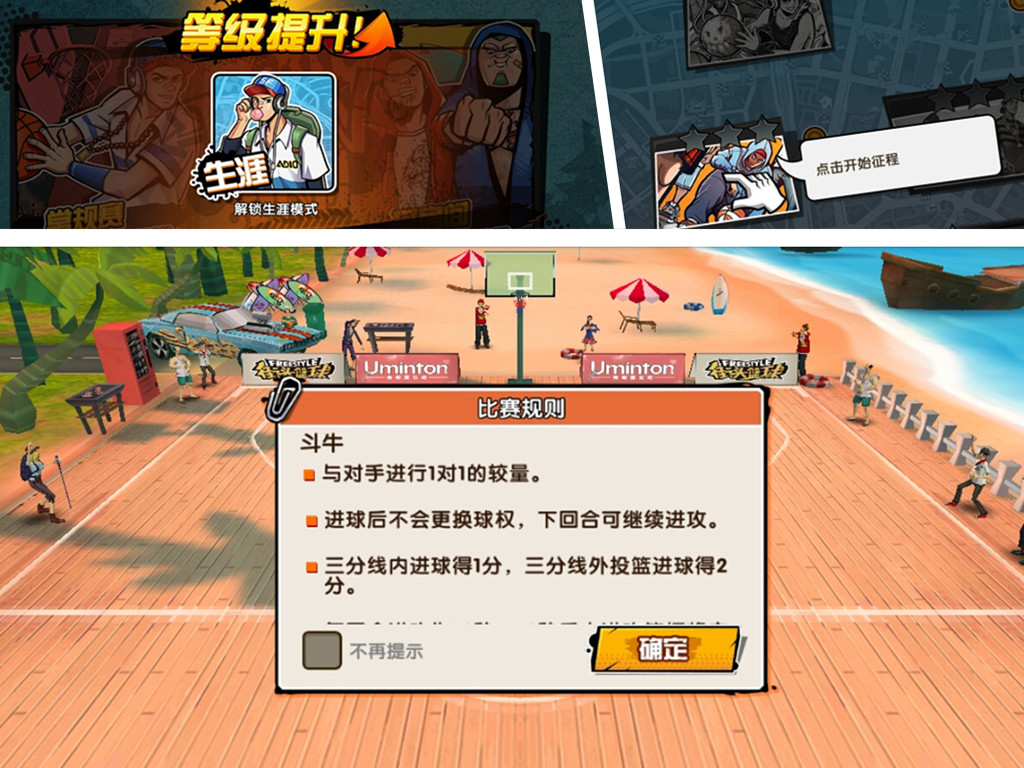 每一个玩家进入游戏首先会选择自己对于这款手游的接触程度,是新手还是玩过类似的端游,或者其实是这类体育竞技游戏的大神级玩家,都会有不同级别的教学引导。 引导进入单人模式后,系统推荐选定1V1练习场进行基础运球和投篮等操作。 OK,在基础练习通过以后我们就可以进行一场3V3的练习赛了。比赛结束除了获得涂鸦墙材料及金币以外,主界面还会显示敌我双方每一个球员在场上的具体数据表现,如助攻比较突出的选手将获得该场的助攻王。 3V3练习赛结束以后球员会获得等级的提升并且解锁技能系统,掌握的技能即可穿戴。 现在我们已经完成了技能系统的学习,接下来将进行对战模式中的3V3常规赛了。 进入常规赛,点击“开始匹配”键进入选择参赛球员的界面,选好球员点击准备,这样我们就可以开始一场真正的街头对决啦!同时每场比赛结束会根据球员在场上的具体表现评选出MVP。在球员养成中将会解锁各种技能,技能解锁后可以通过金币进行购买。根据球员位置的不同,每个球员拥有并且可以学习和佩戴的技能各不相同。 第一场常规赛之后,球员升到5级解锁生涯模式。同时可以看到日常任务,领取日常奖励后可获得活跃度,活跃度达到需求数量以后可以领取活跃宝箱。球员养成的过程中还可以根据等级的提升领取相应的等级礼包。金币。 生涯模式解锁后,再次点击单人模式后在练习场右侧,生涯模式会被点亮。点击“开始征程”进行挑战,生涯模式每一关评星等级最高为3星。生涯模式第一关“球队初成”,至此,1V1斗牛模式正式开启啦~点击立即挑战,1V1斗牛比赛开启时采用投球制决定球权。生涯模式各章节到达一定星级后可领取星级宝箱奖励,每一场的评星越高,越可以更快的拿到奖励哦!赶紧去挑战吧~ 了解更多相关信息,请前往http://sy.yzz.cn/ku/jtlqsy/ (更多游戏资讯请访问叶子猪游戏资讯中心:http://news.yzz.cn/) [编辑:Astory]