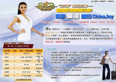 活动四:女儿国争夺战 演绎空前激烈的争夺盛宴 此次“女儿国争夺战”让西游世界再起波澜,各路高手慕名而来,都想在这里一显身手,连续3周获得“女儿国国王”称号的军团长将获得双飞上海参加ChinaJoy,并与中国首席车模翟凌(兽兽)现场亲密接触的机会!此前,翟凌(兽兽)也亲身为《西游记》动情演绎女儿国国王的形象,受到了玩家们的喜爱。此次兽兽与玩家零距离亲密接触想必更会引起一场西游热潮。此外,所有军团成员还将有机会获得588绑定元宝、“骁勇善战”高级称号等丰厚奖励! 首批女儿国国王名单 《西游记》由蓝港在线历时3年精心打造,将经典原著中的故事、人物、场景、法宝等悉数融合,让玩家在奇幻的神话世界中时刻感受斩妖除魔的畅快!游戏中“飞行空战”、“大闹天宫”、“七十二变”等创新的玩法,开创了2D网游全新的PK时代。凭借优秀的游戏品质,《西游记》成为2010年唯一一款囊括三项游戏权威大奖的精品网游,是中国“最受期待的网络游戏”。目前,《西游记》除中国大陆地区外,已进入越南、中国台湾等市场同步测试,成为两大国家、三大地区最具人气的网游新作。 [编辑:灰色] |