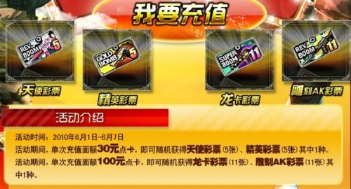 活动时间:6月1日-6月7日 活动介绍: 活动期间,单次充值面额30元点卡,即可随机获得天使彩票(5张),精英彩票(5张)其中一种。 活动期间,单次充值面额100元点卡,即可随机获得龙卡彩票(11张),雕刻AK彩票(11张)其中一种。