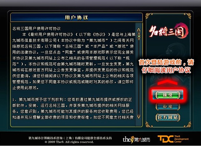 首次登录游戏时请仔细阅读用户协议,阅读后选择“接受”。