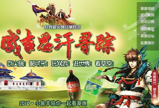近日,国内领先的互动游戏企业麒麟游戏,宣布与国内知名餐饮品牌内蒙古小尾羊餐饮连锁股份有限公司(以下简称“小尾羊”)正式展开异业合作,双方将在全新网游大作《成吉思汗2》的营销推广中展开多个项目的合作,预计将于今年下半年启动。 麒麟与知名餐饮品牌异业合作推广《成吉思汗2》 据悉,双方捆绑营销分为线上与线下两方面。首先,《成吉思汗2》的玩家可免费获得小尾羊全国连锁店的消费代金券,并有机会领取小尾羊独家赞助的世博会门票及参加蒙古草原旅游等活动;其次,麒麟游戏不仅将小尾羊品牌植入游戏中,且食客们在小尾羊全国连锁店消费后,可获得《成吉思汗2》独家大礼包,在游戏中兑换海量经验和超值道具。