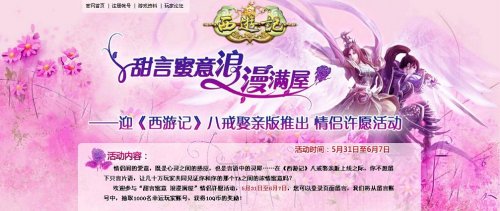 甜言蜜意 浪漫满屋情侣许愿 《西游记》首部资料片“八戒娶亲”新“囍”发布,全新特色玩法集中爆发,一股强烈的西游风暴即将席卷整个神州大地,一段全新的取经之路将由你来完成。作为一款由蓝港在线历时3年精心打造的网游力作,《西游记》堪称是今年最新、最火爆、最华丽的PK网游,原汁原味还原经典名著,独创的“飞行空战”开拓2D网游空中PK时代。这里是神魔共舞的年代,这里是人才辈出的年代,《西游记》正如一颗闪亮的明星散发着无限的光芒!而你将带着绝世神功去扭转这个纷争的乾坤世界!去书写你的取经历程!