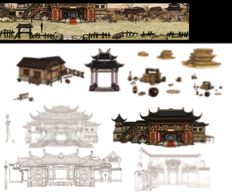 但是,从这些场景原画中,可以明显看出此“中国风”网游所蕴含的特殊性——不符合常规的场景结构,带着典型的横版特征,难道这是一款以中国武侠为题材的横版游戏么?果真如此的话,这将使其在欧系、日系充斥的横版市场独树一帜。下面,让我们通过这些场景原画,对《战魂》的“中国风”创作元素进行一些猜想。