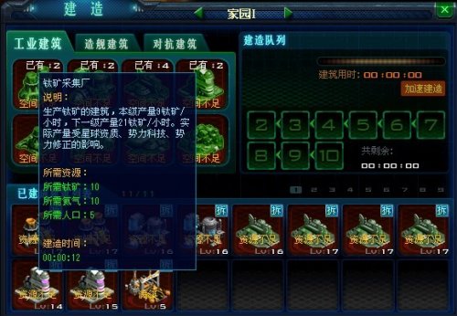 只要您资源足够,建造列表中有空余位置,就可以使用鼠标来轻轻一点,一座钛金属采集工厂就进入建造状态了,看下边的建造列表,一座钛金属采集工厂正在建造中呢!建造完成后,这座工厂就可以源源不断的为您的星球提供所需的钛矿了!怎么样,是不是很方便?