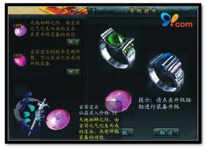 当你手持高等装备招摇过市的时候,你是否注意到周围艳羡的目光?若要对身上装备的武器进行升级,既可以使用可百分百成功升级装备的“玄冥精魄”,也可以用 “玄冥宝石”来试试运气,神兵会为玩家带来在气血内力和攻击上的加成。