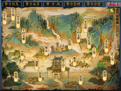 势力山河社稷图 加入势力的玩家可以在势力面板中看到全新的页面“势力建筑”,在这个页面中,玩家可以看到势力的“山河社稷图”,其中有林林总总的大小建筑。这些建筑可不是乱建,每个建筑都有自己的顺序和功能。除了基础建筑“聚义厅”外,还有增加势力人口的民居、交易资源的集市、储藏各种资源的仓库等。 是不是有点策略类游戏的感觉?没错,势力的建设是一件需要深思熟虑的事情。在资源有限的情况下,是应该全面均衡发展,还是集中精力采集某种资源,并在集市上交易?不同风格的势力主将会打造出截然不同的势力。