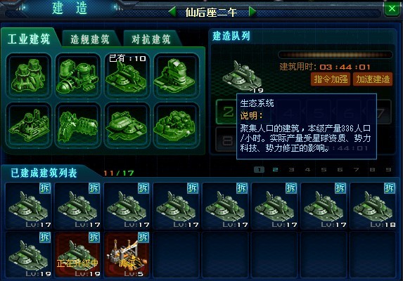 “虽然我也知道人很重要,但是我认为我目前比较急缺的是钛矿和氦3,所以我打算把模拟生态系统换成前两种工厂 ,你觉得呢?”恩,很有想法!那么就像以往一样,在图中右侧的已完成的建筑列表中,找到你要拆除的模拟生态系统,点击它 右上角的拆按钮来开展你的改造计划吧!