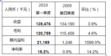 2010年6月11日,中国领先的网络游戏开发及运营商——网龙网络有限公司(以下简称“网龙”, 股份代号:777)公布截至2010年3月31日止的第一季度未经审核财务业绩。数据显示,网龙2010年第一季度收益约为人民币 1.39亿元,收益环比增长约4%,同时,第一季度的净利润率为15.2%,较2009年第四季度0.9%的净利润率有显著提高。
