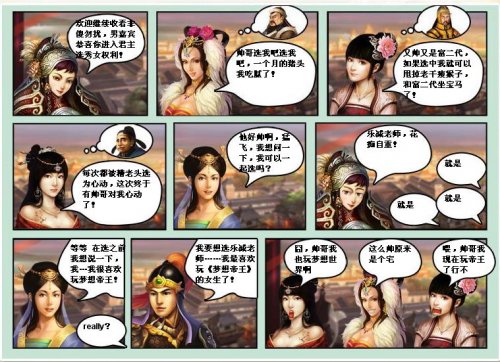 游戏之余,有才的玩家还利用了《梦想帝王》的精彩原画和场景创作出精彩的爆笑漫画!如果你也想玩转六朝君主和名将美女,让他们演出一场《雷雨》般的悲剧,或是一场从头到尾笑不停的相亲秀,不妨来参加《梦想帝王》创意对白大赛,试试自己的才华?