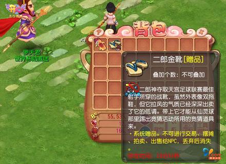 世界杯上的金靴,谁不爱谁不抢。但想要穿上它,除了成为世界杯上的第一射手,还有就是在《开心》花花世界。在7月7日前,找仙隐城·五洲仙子,送你去绿茵场找罗天君,用10点仙元或30点灵石,即可换取到30分钟或60分钟的二郎金靴。不要小瞧这双“名贵”的球鞋,带上它与绿茵场上的仙灵球踢球,还有机会获得大力神币、金球令,这可是你夺得《开心》世界杯大奖的“门票”哦!