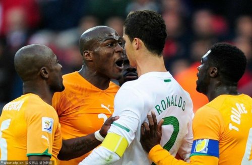 北京时间2010年6月15日22点,2010年南非世界杯小组赛G组科特迪瓦VS葡萄牙的比赛在伊丽莎白港的曼德拉海湾球场进行,双方0-0战平。 比赛进行到19分钟,C罗认为对方对自己有犯规动作,与科特迪瓦20号发生口角,并有肢体接触动作。主裁各打50大板,分别给两人一张黄牌。 |