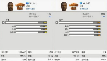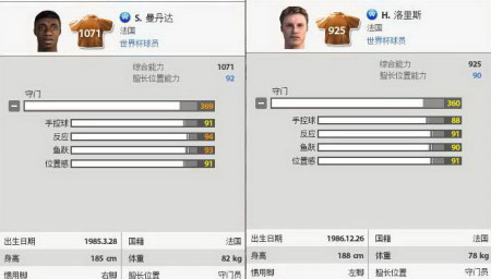 门将多梅内克带上了马赛门将曼丹达和里昂的洛里斯,曼丹达在国际足联官方授权的足球网游《2010 FIFA 世界杯Online》中守门员技术相当出色,369的总数值中各项细化数值都超过的90。而洛里斯是本赛季欧洲联赛中表现最好的法国籍门将之一,360的守门员数值也足可担当大任了。 后防线上,法国队仍然会倚重老将加拉,《2010 FIFA 世界杯Online》中加拉抢断99,盯人90头球93确实也配得上法国的后防线核心角色。与他搭档中后卫组合的会是来自斯奎拉奇或是阿比达尔,在《FIFA online 2》防守数值363。这三名中后卫实力相差无几,比赛中更多的应该是根据个人状态和体能情况轮换出场。