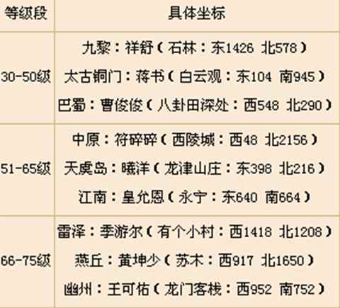 在大荒的各个区域会出现发布世界杯任务的主持人,每个等级段,玩家每天只能选择以下其中一人领取任务。他们的详细地点如下: