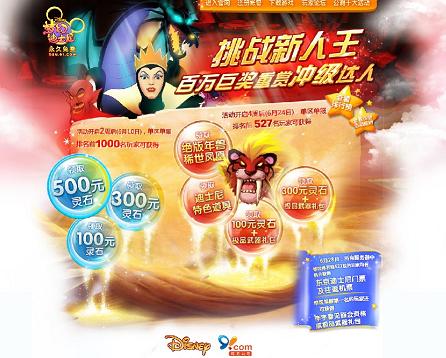 《梦幻迪士尼》“挑战新人王”冲级赛豪华巨奖挑战您的实力。单区排名前528名的玩家,即有机会获得500元灵石、绝版年兽、稀世凤凰、极品武器,海量虚拟世界的稀世奇珍馈赠!获得“新人王”冠军,更有机会获得李宇春玩家见面会门票、东京迪士尼门票及往返机票,巨额现实大奖回馈“冲级达人”!一手游戏,一手拿奖,《梦幻迪士尼》公测酬宾,礼多人不怪!
