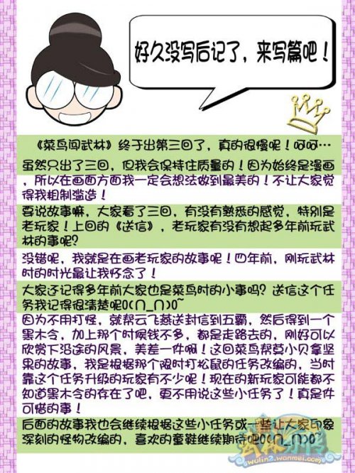 “小魔女☆亲亲”的小菜鸟系列漫画,意在唤起《新武林外传》老玩家们记忆深处的点点滴滴。同时,新玩家们也可以通过漫画中的情节了解到很多现在不常做的趣味任务。以下是“小魔女☆亲亲”想说的话。 玩转《新武林外传》,点滴回忆记心间,然后化作了六扇门的各种精彩作品。更多超炫内容还将陆续来袭,敬请密切关注《新武林外传》官方网站。 网通三区 天上人间 电信四区 金碧辉煌 6月18日 嘉年华双新服同步开启 永久免费的喜剧网游《新武林外传》“完美密码保护”服务已经全线开启,为确保您的账号安全,推荐您使用免费赠送的“完美密码保护”服务。 [编辑:灰色] |
