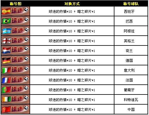 6月18日——7月1日,限量版世界杯球迷称号兑换火热进行!使用“球迷的热情”和暗之宝箱开出的“暗之碎片”、就可兑换各大夺冠热门球队的限量版称号!