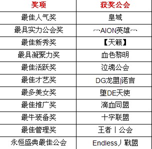 6月19日的杭州,天空有些阴沉,湿热的天气并不能阻挡来自全国各地永恒之塔精英公会的玩家热情,他们应邀来到位于杭州西湖畔的蓝天·清水湾国际大酒店,参加GREEN AION年度十大风云公会的评选以及颁奖盛典。这次永恒之塔年度十大风云公会评选工作,是由全球芯片巨头AMD、国内网游领导级厂商盛大游戏旗下当红网游巨作——永恒之塔携手发起的。国内顶尖的永恒之塔60大网游公会的会长,受邀来到美丽的杭州,论剑西湖。经过网友的投票,以及人气数量、美誉度好评,召集玩家加盟数量等环节的综合评定。最佳人气奖被皇域公会摘得;灬AION英雄灬获得最具实力公会奖;【天籁】获得最佳新秀奖;血色黎明获得最具凝聚力奖;泣魂公会获得最佳活跃奖;DG龙盟|诺言获得最佳才艺奖;堕DE天使获得最多美女奖;滴血同盟获得最佳推广奖;十字联盟获得最牛装备奖;王者丨公会获得最佳管理奖。除上述获得十大风云公会称号以及瓜分各自奖项以外,在这次活动中,Endless丿戰盟公会表现非常突出,公会会长提出很多想法和意见,对游戏未来的发展都起到很好的帮助。因此,本次永恒盛典最佳公会的荣誉被授予Endless丿戰盟。