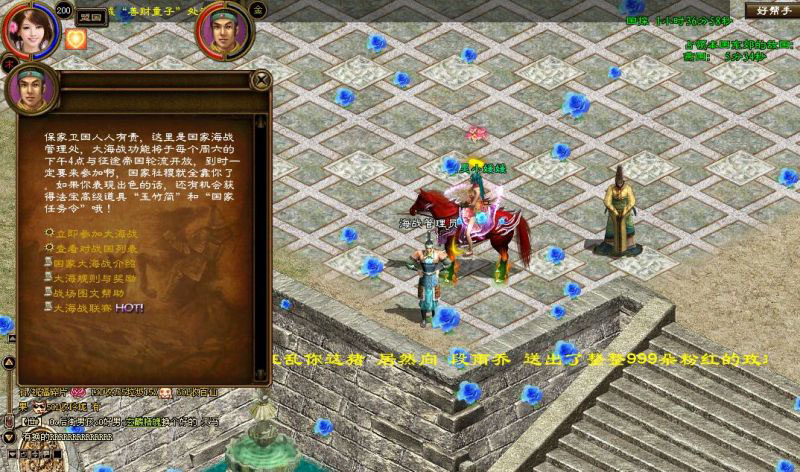 大海战是国家与国家之间的战斗。系统随机将十个国家进行1 VS 1的分组PK。在大海战开始时,玩家可以通过王城的海战管理员参加,或者直接点屏幕右上方的好帮手,加入大海战。每次海战时间为90分钟,一方的大本营被摧毁,即判定为失败,战争结束。若在限定的90分钟内,双方的大本营均未被摧毁,则按双方的伤亡数字判定,哪方伤亡数小,则判定哪方为赢者。参战双方都可以获得海量经验,而个人海战积分前10名的玩家,还可以获得道具奖励。