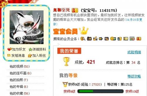 看他的详细资料和所发布的作品,原来他还游弋于跑车类游戏,并且跑车类的视频所展示的技术不错,名副其实的多能手啊!其人缘很不错,也许这根他担任CF版主很负责任有关系,每天都能看到他在专区里挑选遗漏的精华作品,然后提交给官方来补上精华;而且很配合官方组织的CF活动,评奖也公正严明。“银弹”这一词已经在CF专区耳熟能详,多半是指游戏中够猥琐、够阴,而在现实中表现得有点色色的,不知道有没有玩家用它来描述無聊至死!