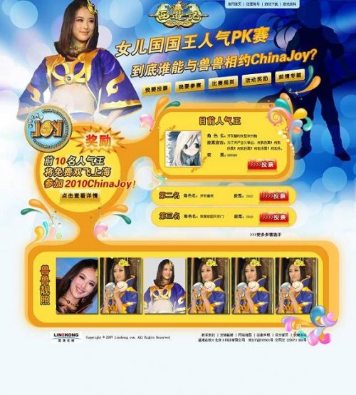 在紧张激烈的女儿国争夺战中,第一阶段的活动已经落下帷幕。傲视群雄连续3周获得“女儿国国王”称号的军团长已经产生,他们将有资格参与后续的玩家投票环节,最终的“人气国王”将由所有的西游玩家选出,各位国王可利用这段时间多为自己拉拉选票……最终由玩家投票选出10位“人气国王”获得双飞上海参加ChinaJoy。凡是参与投票的玩家都有机会获得Q币、“永久连心”情侣账号等奖励。官方还将从参与投票的玩家中挑选出3名“超级粉丝”,与“人气国王”一同双飞上海参加chinajoy!