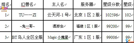 6月28日7:00,《开心》第三届养宠争霸赛,在经过数月的斗智斗勇后,终于完美落幕。北京1区2服玩家“云天河-1号”,凭借102星“TU——ZI”,力压劲敌福建1区1服玩家“漂游虫”、广东1区1服“Magic小魔星”等众高手荣登冠军宝座,以绝对优势捧走价值5000元灵石、+15本门派仙品一洞衣服、+15仙品一洞装备、冠军专用外套等大奖,同时还可额外兑换+13仙品一洞装备。全区全服排行榜前5名如下: