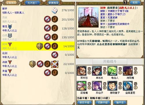 综合来说,把点数平均分配到三项属性性价比是最高的。全配防御的配点方式只是作为一种过渡建议,建议到后期洗点重配。一般来说全配攻击伤害是高手的做法,这样的配点方式的确可以把属性的威力发挥到极致,但如果不幸被对手输出则会非常地痛,对自己的技术有信心的人可以选择一试…… 竞技场 合理分配好你的点数,努力提升自己的等级,打败所有高级对手,为成为第一天神加油吧! 关于游艺《神魔令2》: 游艺《神魔令2》是国内第一款卡牌对战网页游戏。游戏取材自中国神话背景,加以丰富奇妙的想象,游戏世界活泼欢快。游艺《神魔令2》采用格斗对战方式,五分钟便可以轻松完成一局对战。玩家可以享受:在激烈的联赛中争夺 No.1 从而获得丰厚奖励;或者成为卡牌交易的大亨在市场上翻手为云覆手为雨;抑或仅仅享受一杯清茶在手与好友对弈的轻松写意…… 首款“真战棋”战争策略类网页游戏 全球首款第三代“三国”战争策略类网页游戏 借鉴中国经典武侠小说艺术特色而全新构建的网页版武侠经营题材WebGame [编辑:糖糖] |
