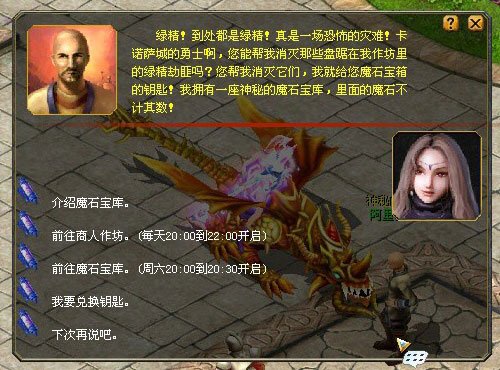 在《魔域》世界里,砸装备要魔石,合宝宝要魔石,连泡妞也要魔石,魔石不是万能的,但是没有魔石却万万不能。但是,能在这个魔幻的世界里白手起家、稳赚不赔吗?答案是:有!“阿里巴巴魔石宝库”日常活动火热进行中,千万财富等你来洗劫。 天降横财 不抢白不抢 神秘商人阿里巴巴来到了卡诺萨城,向每一个过路的勇士求助。绿精劫匪闯入了他的作坊,抢走了他的货物箱子。阿里巴巴愿意用魔石宝箱的钥匙来换取自己的货物,重金之下必有勇夫,天上飞来了横财,只要消灭绿精劫匪,就可抢夺千万财富,维护正义之余还能获得丰厚奖励,不抢白不抢呀。 |