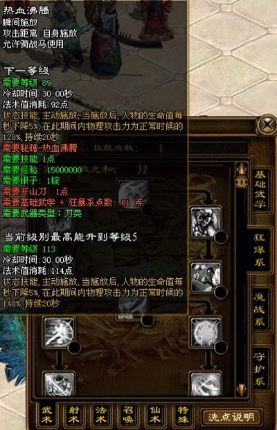 修“热血沸腾” 穷二代的逆向思维 在《绿色征途》中,“热血沸腾”被戏称为“自杀技能”,一旦修成,每提升1级技能,便可提高人物攻击120%,但发动技能后20秒内,每秒会下降5%血量,直至20秒后血量耗尽。 “热血沸腾”就像一把双刃剑,聪明的穷二代展开逆向思维,利用它来节省回城道具:有时急于回城,又惦记着节约为本的原则,想省几个回城卷,这时“热血沸腾”就能大展拳脚了!发动技能后,边虐怪边掉血,短短20秒就能“光荣就义”,回城复活! 家族跑商中,“热血沸腾”更有大用途!由于不允许坐车和使用传送道具,利用“热血沸腾”迅速回城,既节约道具又增加跑商效率,能为玩家带来更多银卡、经验奖励! 热血沸腾