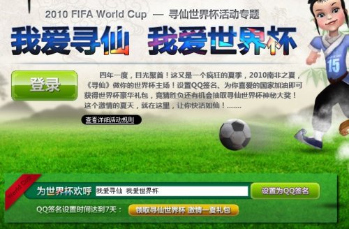 “星星之火可以燎原”第十九届2010南非世界杯正在火热进行中。广大球迷朋友都在用各种各样的形式为世界杯加油助威!喜爱世界杯的你。喜欢寻仙的你,又是用什么样的方式在为世界杯助威加油的呢? 为了庆祝这4年一次的世界杯,举世欢庆。2010年6月9日到2010年7月12日,《寻仙》也为大家隆重推出了一系列活动。各种丰厚的礼品,炫酷的称号,帅气的宠物等待你的到来。 从南非世界杯开幕的那一天,小记就一直希望有个平台可以为世界杯加油助威,向世界杯球场第一线传达自己的对世界杯的祝福。当《寻仙》倾情推出“为世界杯参赛队伍加油助威”送大礼的活动时,这让小记惊喜不已。 |