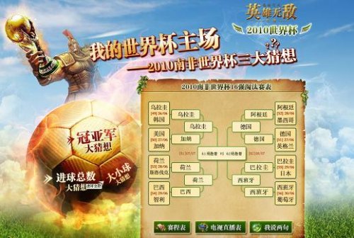 万人欢腾,全球震撼的世界杯已经进入了白热化阶段,决赛圈剩下的四支球队有黑马之首巴拉圭,老牌劲旅德国、西班牙,更有击败五星巴西的橙色军团荷兰。究竟决赛会上演怎样的强强对话,让我们拭目以待。作为同样以竞技闻名的《英雄无敌在线》此时此刻也迎来了最精彩的巅峰大战,世界杯冠亚军竞猜日渐明朗,参与人数众多。更有全新军团争霸战诠释世界杯一样的精彩。 英雄世界杯 |