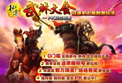 《征途》“天下第一国”烽烟未散,玩家又将迎来史上最刺激的全民激情PK赛——“武林大会PK段位联赛”。据了解,该联赛完全0门槛,任何玩家都可参与!是一场全区玩家共同参与的激情赛事!参与者将有机会获得海量经验、游戏道具,乃至数万元现金大奖! 赛制最公平——草根玩家盛会! 《征途》“武林大会PK段位联赛”将首次采用全智能对手匹配系统,根据玩家实力自动选出实力最相近的对手。不用担心在赛场上遭遇强手而导致落败,也不用担心对手太弱而毫无挑战性。在“武林大会”中享受到的,将是实力相近,针尖对麦芒的畅爽PK快感! “武林大会”中,参赛者遭遇的同段位对手,与自己等级、实力相当,大家拼的就是PK手法和临场状态,如何发挥自己的操作技巧才是制胜关键。 0门槛全民参与——共享武林盛会! “武林大会”还有一个很突出的看点:0门槛,全民可参与!联赛分为9大段位,无论是59级极品小号,还是202级高手,都可以在适合自己的段位里,与实力相近的对手PK,争夺“段位王”,共享武林盛会 终于摆脱“骑天大剩”这个称号了 以往的赛事中,一些玩家因等级和装备都较为普通,“沦落”为场外围观的“剩男剩女”。有一位玩了4年《征途》,做了4年小号的玩家甚至“内牛满面”感叹道:“‘武林大会’推出后,我终于可以摆脱‘骑天大剩’这个称号了!” |