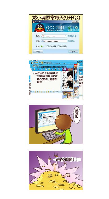 玩家龙小魂每天照常登陆QQ,聊天窗口如雪片般弹出,每个窗口不但签名统一而且都在传达一个信息:小魂,赶紧将签名改成:龙魂终极封测 高价收购QQ签名!小魂半信半疑的改了签名,只听“哗啦”一声,大堆Q币从天而降! [编辑:灰色] |
