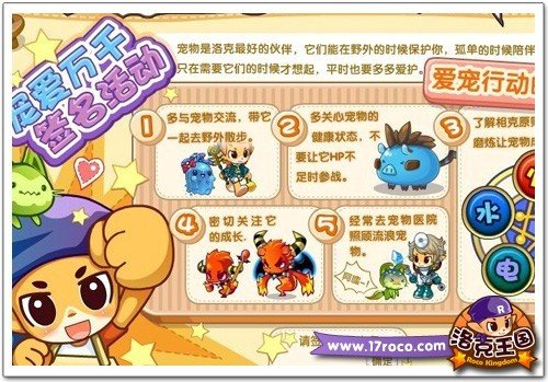 爱宠五项提倡 由于宠物越来越多,所以宠物医院的院长萌萌有点忙不过来了,她需要小洛克的帮忙,小洛克们赶紧去宠物医院做萌萌的小助手吧!宠物园的一些小宠物生病了,富有爱心的小洛克们赶紧去帮帮他们吧。另外,王国还举行了万人签名爱宠行动,热爱宠物的小洛克,赶紧去签上自己的名字吧。 小朋友们,喜欢可爱的宠物精灵吗?你现在是否拥有属于自己的爱宠呢?那就赶紧来《洛克王国》参与爱宠大行动吧!不仅能奉献你的爱心,还可以得到丰厚的奖励哦! [编辑:糖糖] |